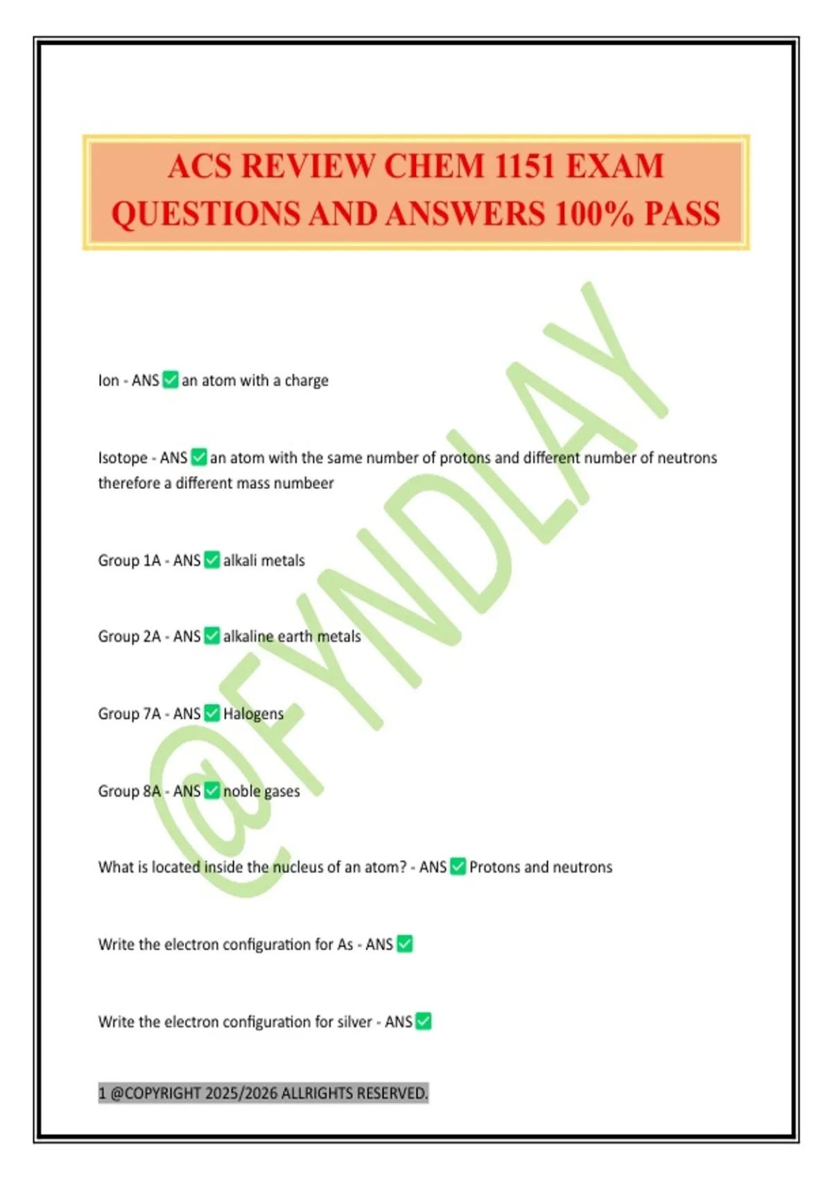ACS REVIEW CHEM 1151 EXAM QUESTIONS AND ANSWERS 100% PASS