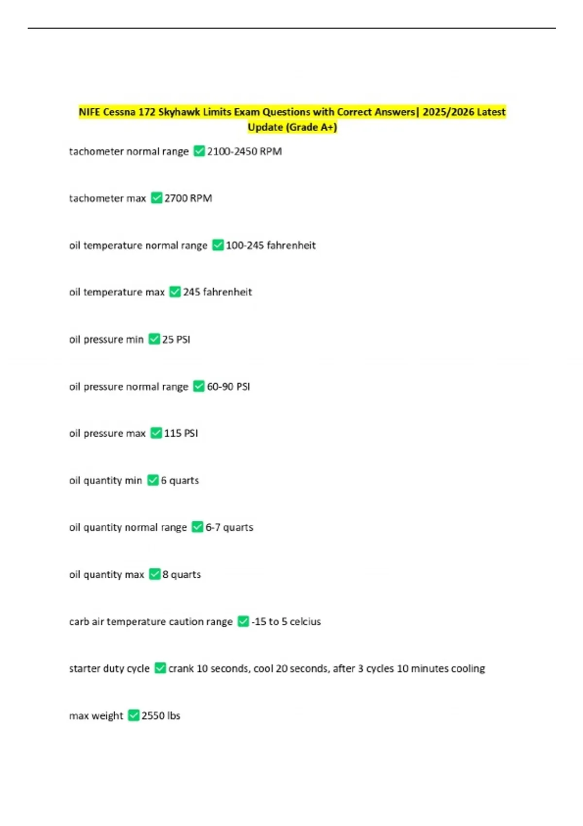 NIFE Cessna 172 Skyhawk Limits Exam Questions with Correct Answers| 2025/2026 Latest Update 2 Exam (elaborations) NIFE Aerodynamics - Unit 1 Questions withNIFE Aerodynamics - Unit 1 Questions with Correct Answers| 2025/2026 Latest Update 3 Exam (elaborations) NIFE Aero Exam Questions with Correct Answers| 2025/2026 Latest Update 4 Exam (elaboration