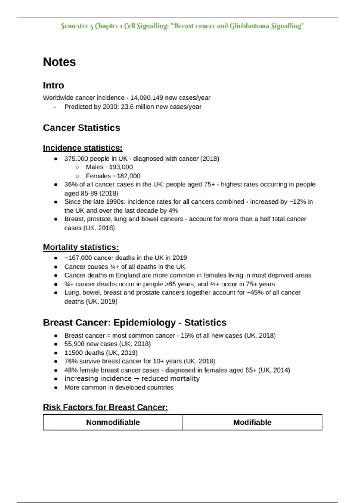 This document provides a comprehensive study resource on breast cancer and glioblastoma signaling, designed for semester-level coursework and exam preparation. It covers: Epidemiology & statistics (global and UK incidence/mortality); Risk factors (modifiable and non-modifiable); Diagnosis methods (clinical, imaging, histopathology).; Breast cancer subtypes (Luminal A/B, HER2+, triple-negative); Estrogen receptor biology (ERα activation, phosphorylation sites, signaling pathways); Therapies (endocrine, targeted, chemotherapy, immunotherapy); Mechanisms of tamoxifen resistance (MAPK, PI3K–AKT–mTOR, WNT–β-catenin, Cyclin D1–CDK4/6); Alternative therapeutic strategies (HER2-targeted agents, TKIs, VEGF/mTOR inhibitors, HSP90 inhibitors, vaccines). To maximize exam readiness, the document also includes: A revision sheet summarizing the most important facts; A set of flashcards (Q&A format) for quick recall; A mini MCQ bank to test understanding of key mechanisms and therapies. This makes it not just lecture notes, but a complete toolkit for mastering cancer signaling