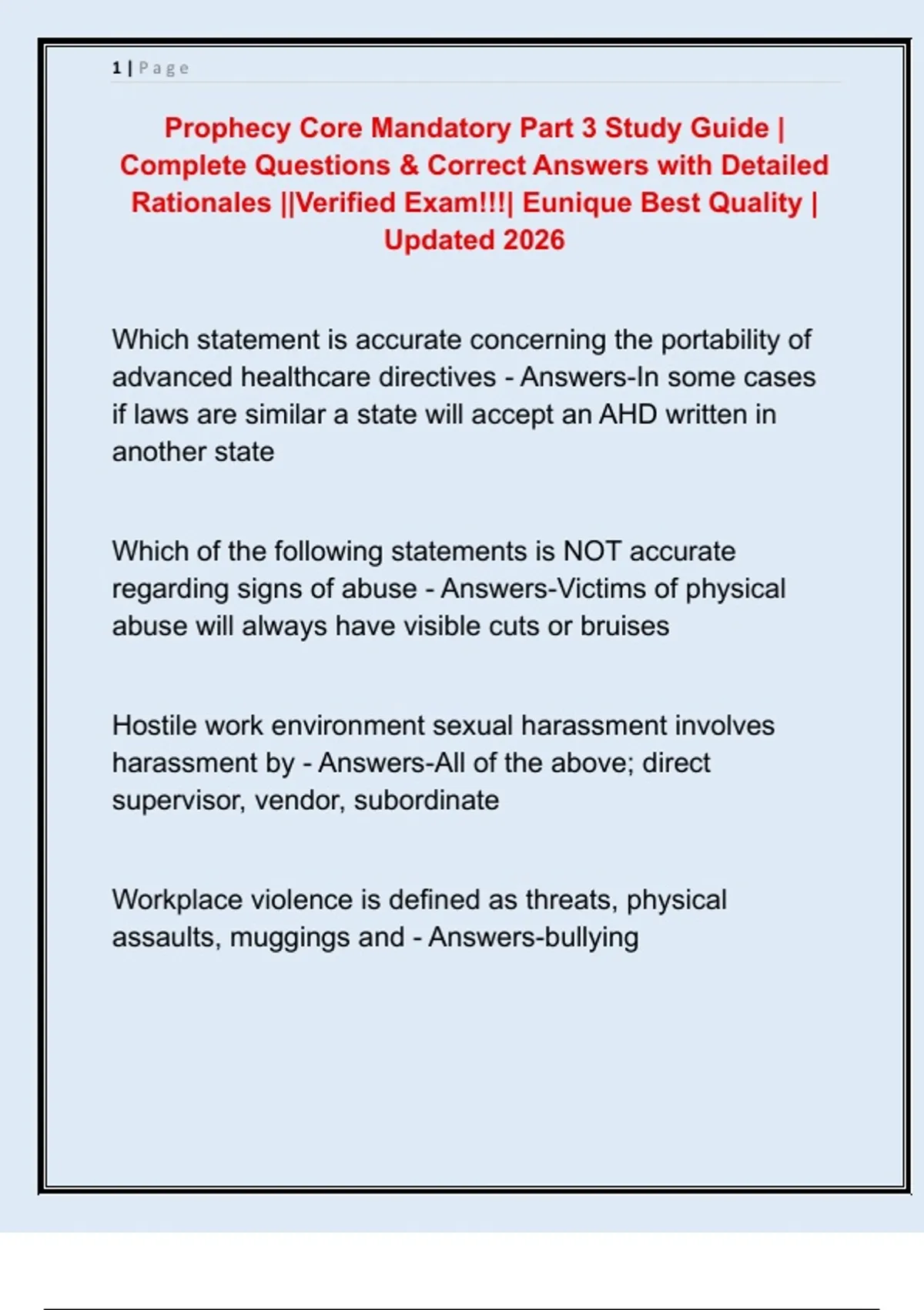 Prophecy Core Mandatory Part 3 Study Guide | Complete Questions & Correct Answers with Detailed Rationales ||Verified Exam!!!| Eunique Best Quality | Updated 2026