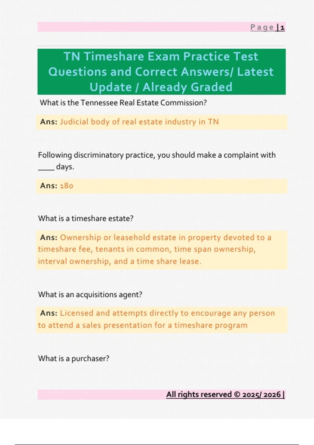 What is the Tennessee Real Estate Commission? Ans: Judicial body of real estate industry in TN Following discriminatory practice, you should make a complaint with ____ days. Ans: 180 What is a timeshare estate? Ans: Ownership or leasehold estate in property devoted to a timeshare fee, tenants in common, time span ownership, interval ownership, and a time share lease. What is an acquisitions agent? Ans: Licensed and attempts directly to encourage any person to attend a sales presentation for a timeshare program What is a purchaser? Page | 2 All rights reserved © 2025/ 2026 | Ans: Anyone who buys timeshare What is an exchange agent? Ans: An agent for an exchange program What is a sales agent? Ans: Person acting as a seller of any Time Share contract (only sell under specific time share developer) Anyone who sells timeshare. What is a person that sells more than 5 timeshares a year that are not their own? Ans: Timeshare resale broker What is a unit?` Ans: Real property improvements in a project which is divided into timeshare program. What is a managing agent? Ans: Person with management duties and responsibilities and obligations of a timeshare program Page | 3 All rights reserved © 2025/ 2026 | What are timeshare units? (what can be a timeshare) Ans: Anything can be a timeshare unit unless expressly prohibited by project instruments or local governing laws What should be included in the Public Offering Statement? Ans: name of county where property is located legal description of property ID of time periods by letter, name and number ID of timeshare estates and how many units can be a timeshare Common expenses and voting rights any restrictions on use occupancy alterations or alienation of timeshare units ownership interest/maintenance provisions/ replacement ____ must be provided to each purchaser of a timeshare. Ans: Public Offering statement When must you give a public offering statement? What is the