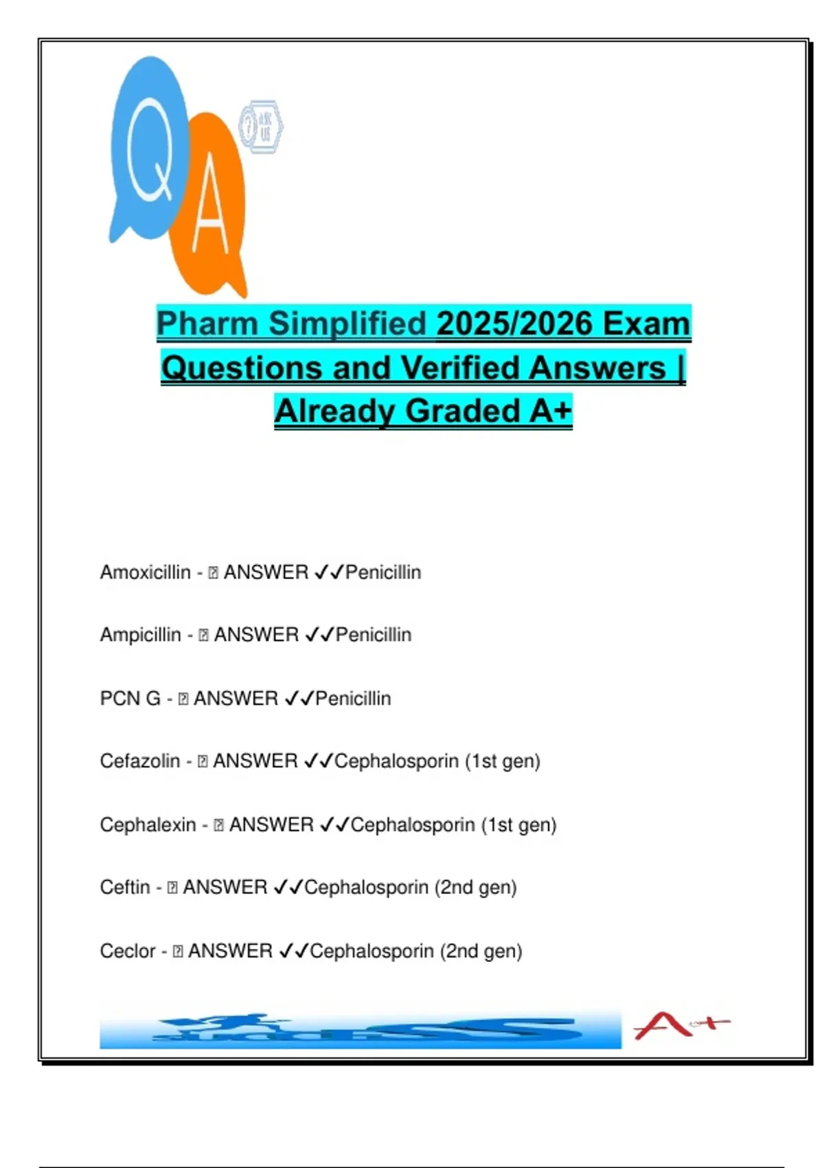 This A+ graded reference provides a high-yield breakdown of over 100 pharmacological agents, their mechanisms of action, drug classes, clinical indications, side effects, and drug of choice (DOC) status—designed for MED210 – Integrated Pharmacology and optimized for 2025/2026 exam prep. Presented in a simplified flashcard-style Q&A format, it ensures rapid recall and application in academic and clinical contexts. Covered content includes: Drug Classifications: penicillins, cephalosporins (1st–3rd gen), carbapenems, monobactams, macrolides, tetracyclines, aminoglycosides, sulfonamides, antifungals (triazoles, polyenes, echinocandins), antivirals, TB drugs, respiratory meds (SABA, LABA, ICS, PDE4 inhibitors), and more Mechanisms of Action (MOA): e.g., protein synthesis inhibition (30S, 50S), DNA synthesis blockers, ergosterol synthesis inhibition, bacterial cell wall disruption, viral replication interference Drugs of Choice (DOC) for specific diseases: syphilis, cryptococcal meningitis, PJP, and life-threatening fungal infections Toxicities & Side Effects: QT prolongation (fluoroquinolones, ketoconazole), ototoxicity (aminoglycosides), hepatotoxicity (isoniazid), and teratogenicity (ribavirin, fluconazole) Pharmacokinetics (ADME): bioavailability, metabolism (CYP450), renal elimination, CrCl norms Pregnancy Categories: A, B, C, D, and X designations with real-drug examples Perfect for: Medical, Pharmacy, and PA students preparing for system-based or general pharmacology exams Nursing, NP, and allied health students who need a fast, accurate pharmacology overview USMLE Step 1, COMLEX, NCLEX candidates, or anyone preparing for pharmacology boards IMGs and clinical interns reviewing key therapeutic agents and clinical pharmacology essentials This concise yet comprehensive document supports deep learning through clear associations, helping learners master drug classifications and mechanisms with clinical precision. Keywords: pharmacology, MED210, drug classes, MOA, side effects, DOC, penicillins, cephalosporins, macrolides, antifungals, antivirals, TB drugs, SABA, LABA, ICS, QT prolongation, hepatotoxic drugs, teratogenic drugs, CYP450, ADME, CrCl, pregnancy categories, aminoglycosides, fluoroquinolones, sulfonamides