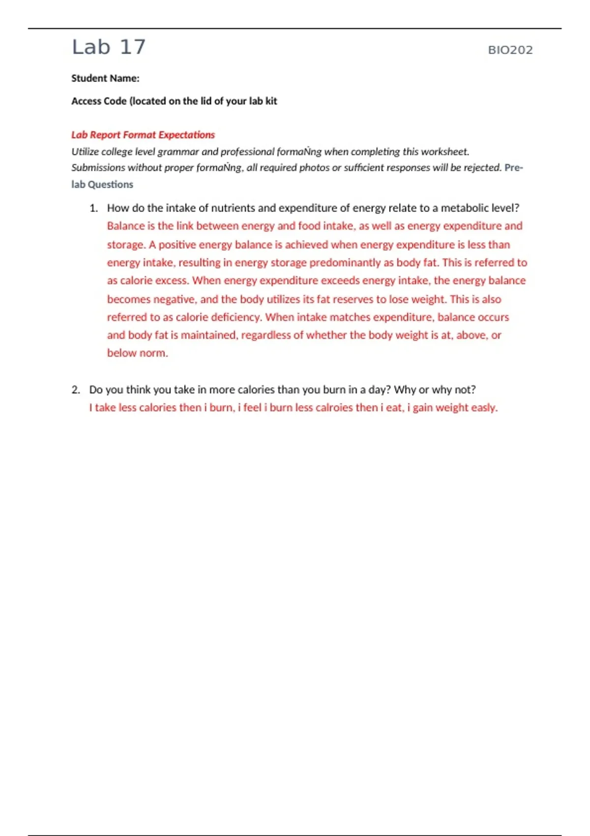 Utilize college level grammar and professional formaṄng when completing this worksheet. Submissions without proper formaṄng, all required photos or sufficient responses will be rejected. Pre- lab Questions 1. How do the intake of nutrients and expenditure of energy relate to a metabolic level? Balance is the link between energy and food intake, as well as energy expenditure and storage. A positive energy balance is achieved when energy expenditure is less than energy intake, resulting in energy storage predominantly as body fat. This is referred to as calorie excess. When energy expenditure exceeds energy intake, the energy balance becomes negative, and the body utilizes its fat reserves to lose weight. This is also referred to as calorie deficiency. When intake matches expenditure, balance occurs and body fat is maintained, regardless of whether the body weight is at, above, or below norm. 2. Do you think you take in more calories than you burn in a day? Why or why not? I take less calories then i burn, i feel i burn less calroies then i eat, i gain weight easly.