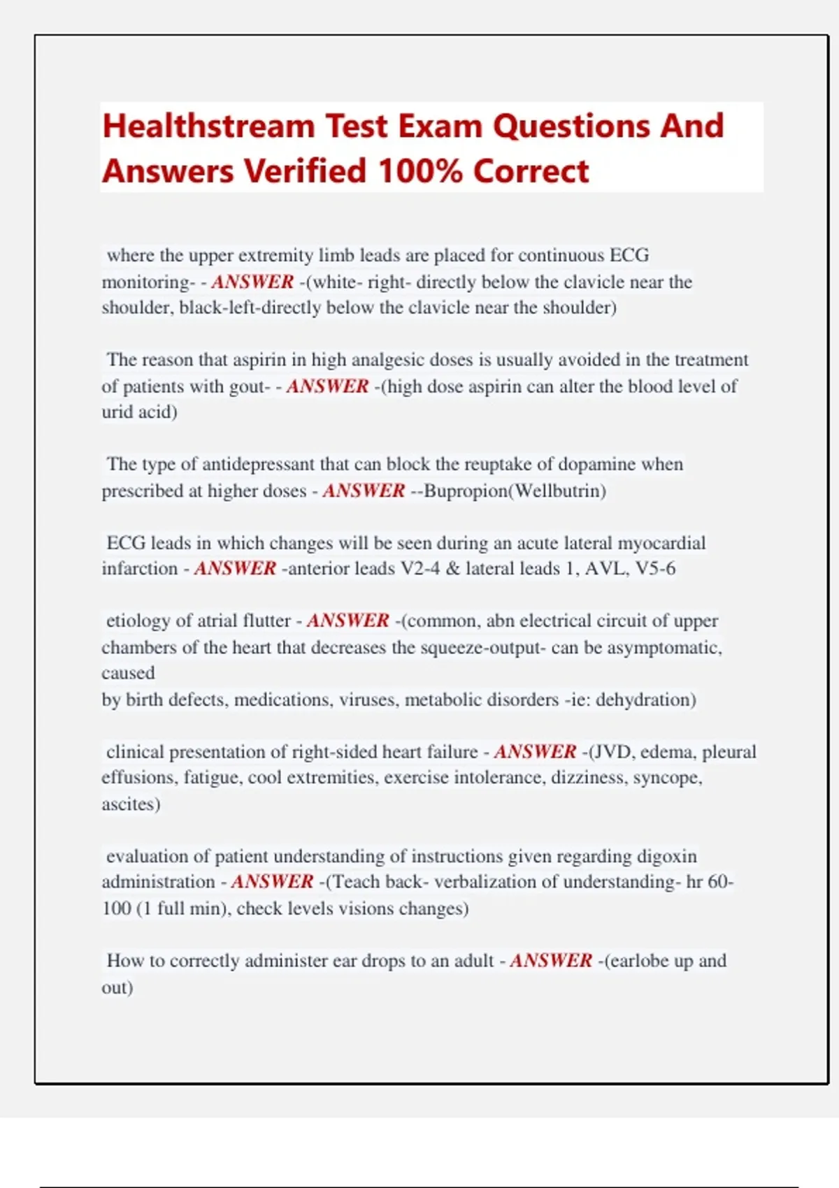 Healthstream Test Exam Questions And Answers Verified 100% Correct where the upper extremity limb leads are placed for continuous ECG monitoring- - ANSWER -(white- right- directly below the clavicle near the shoulder, black-left-directly below the clavicle near the shoulder) The reason that aspirin in high analgesic doses is usually avoided in the treatment of patients with gout- - ANSWER -(high dose aspirin can alter the blood level of urid acid) The type of antidepressant that can block the reuptake of dopamine when prescribed at higher doses - ANSWER --Bupropion(Wellbutrin) ECG leads in which changes will be seen during an acute lateral myocardial infarction - ANSWER -anterior leads V2-4 & lateral leads 1, AVL, V5-6 etiology of atrial flutter - ANSWER -(common, abn electrical circuit of upper chambers of the heart that decreases the squeeze-output- can be asymptomatic, caused by birth defects, medications, viruses, metabolic disorders -ie: dehydration) clinical presentation of right-sided heart failure - ANSWER -(JVD, edema, pleural effusions, fatigue, cool extremities, exercise intolerance, dizziness, syncope, ascites) evaluation of patient understanding of instructions given regarding digoxin administration - ANSWER -(Teach back- verbalization of understanding- hr 60 100 (1 full min), check levels visions changes) How to correctly administer ear drops to an adult - ANSWER -(earlobe up and out) The rate at which IV saline should be administered to a patient with diabetic ketoacidosis during the first hour of treatment - ANSWER -(bolus) The action of dexamethasone when given to patients with thyroid storm - ANSWER -(inhibit hormone production and decrease peripheral conversion from T4 to T3) The reason that enteric-coated tablets should not be broken - ANSWER -(may result in the drug being released too early, destroyed by stomach acid or irritating the stomach lining) An important characteristic of acetaminophen - ANSWER -(raises the body's pain threshold by inhibiting prostaglandin synthesis in the CNS) The thrombolytic drug that is more likely to cause an allergic reaction - ANSWER -alteplase The length of time the patient should be encouraged to retain a bisacodyl rectal suppository to relieve constipation - ANSWER -15 - 20 min most common cardiac valve dysfunction in the United States, often considered a disease of "wear and tear"- - ANSWER -aortic A continuous drip of a medication is ordered at a rate of 2 mg/min. The standard mixture of this medication to yield a final concentration of 2 mg/mL is 1 g of the medication in 500mL of IV fluid. At what rate in milliliters per hour should the IV pump be set? - ANSWER -60 mL/hr A continuous infusion of regular insulin at 7 units/hour has been ordered for a patient with type 1 diabetes mellitus. The pharmacy dispensed a standard insulin infusion containing 100 units of regular U-100 insulin in 100 mL normal saline. At what rate in milliliters per hour should the infusion pump be set? - ANSWER -7 mL/hr A practitioner has ordered 700 mg of an antibiotic. The medication label states, "Add 5 mL sterile water to 1 g of this medication; 0.5 g = 2 mL." How many milliliters should be given? - ANSWER -2.8 mL In patients who have angina, calcium channel blockers: - ANSWER -reduce myocardial oxygen consumption. The nurse is assessing neuromuscular deficiency in a patient with adrenal insufficiency and expects to find that the patient has: - ANSWER -joint/muscle pain. The nurse is caring for a patient who has atrial fibrillation. The patient is attempting to understand why this dysrhythmia developed in him. The nurse educates this patient about his risk factors, including: - ANSWER -diabetes mellitus. The nurse is differentiating between right- and left-sided heart failure in an assigned patient. For right-sided heart failure, the patient presents with edematous extremities, nausea/vomiting and - ANSWER -anorexia. A patient is receiving a unit of blood and begins to display signs and symptoms of a transfusion reaction. What primary nursing action should the nurse take? - ANSWER -Stop the blood transfusion. A patient has been admitted to the telemetry unit with infective endocarditis. During the nursing assessment, the nurse notes the confirmatory findings of petechiae, splinter hemorrhages, - ANSWER -Osler's nodes During an acute lateral myocardial infarction, changes will be seen in which ECG leads? - ANSWER -I, aVL, V5, V6 Acute pericarditis is most commonly associated with: - ANSWER -renal failure.