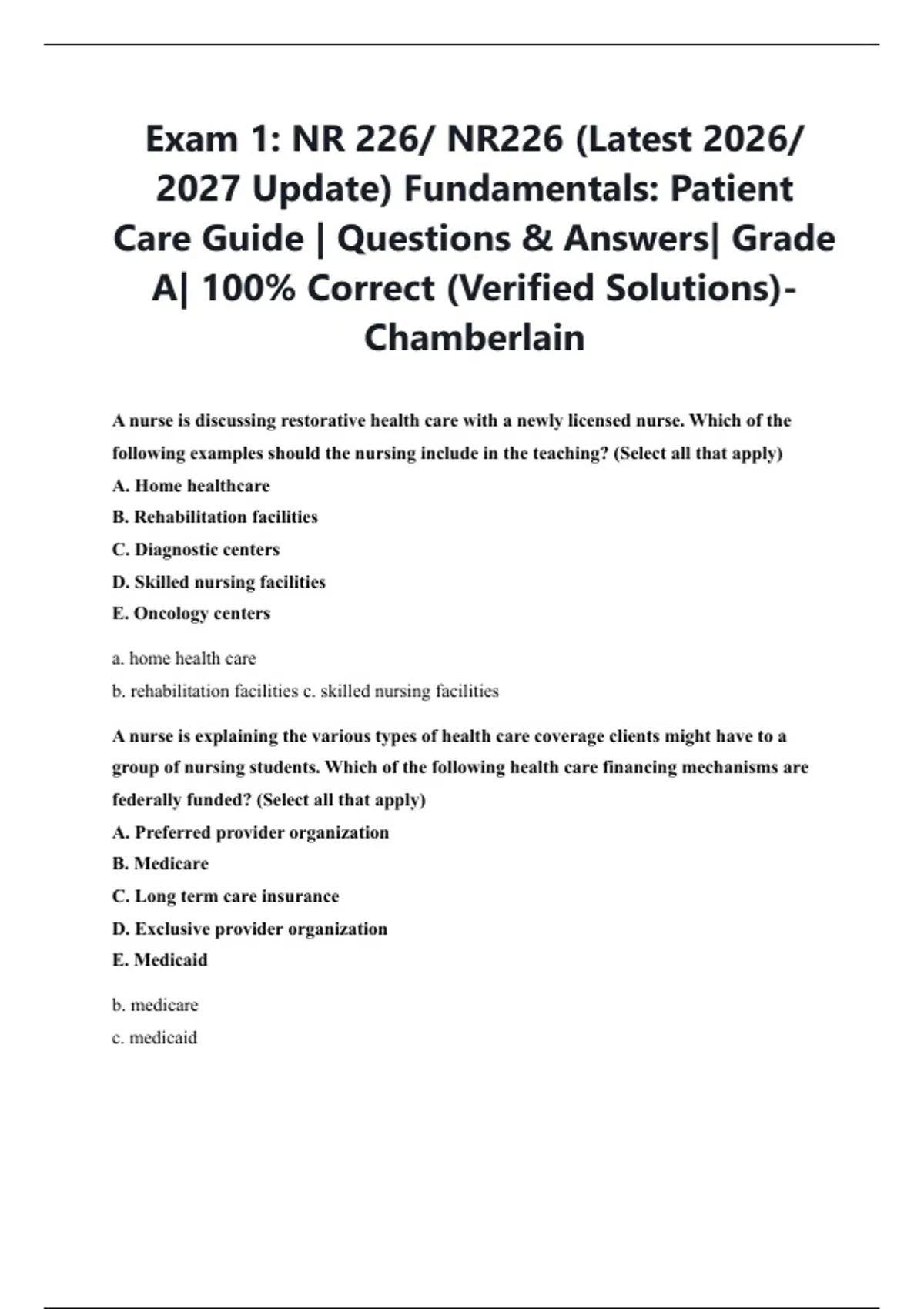 Exam 1: NR 226/ NR226 (Latest 2026/ 2027 Update) Fundamentals: Patient Care Guide | Questions & Answers| Grade A| 100% Correct (Verified Solutions)- Chamberlain