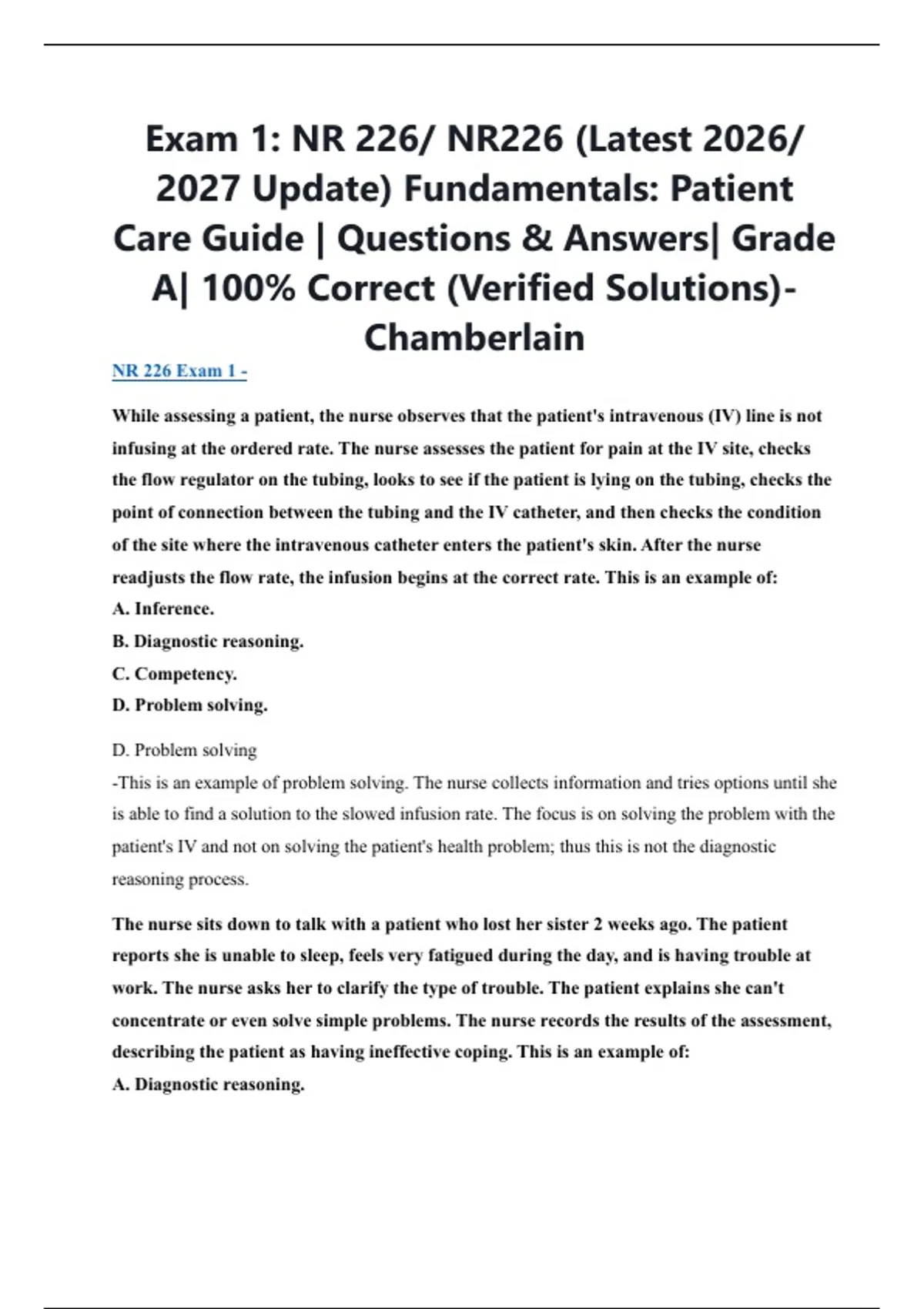 Exam 1: NR 226/ NR226 (Latest 2026/ 2027 Update) Fundamentals: Patient Care Guide | Questions & Answers| Grade A| 100% Correct (Verified Solutions)- Chamberlain