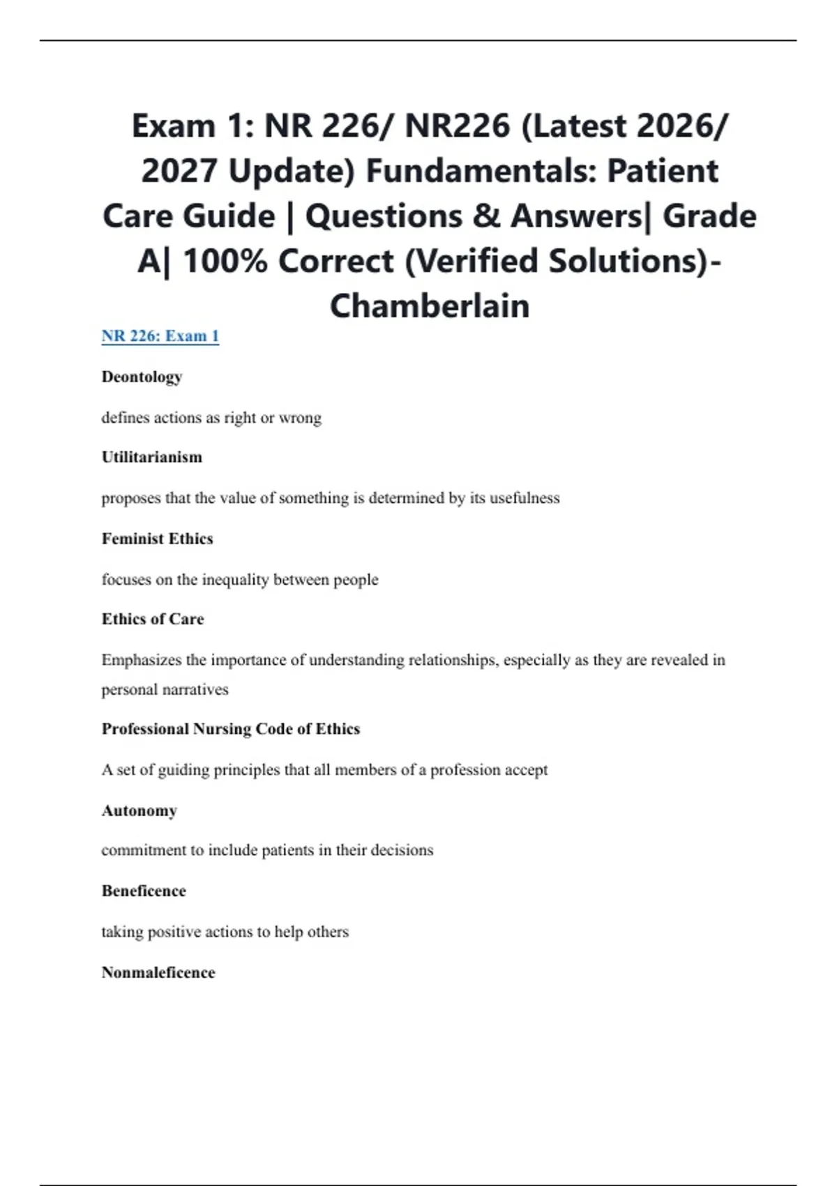 Exam 1: NR 226/ NR226 (Latest 2026/ 2027 Update) Fundamentals: Patient Care Guide | Questions & Answers| Grade A| 100% Correct (Verified Solutions)- Chamberlain