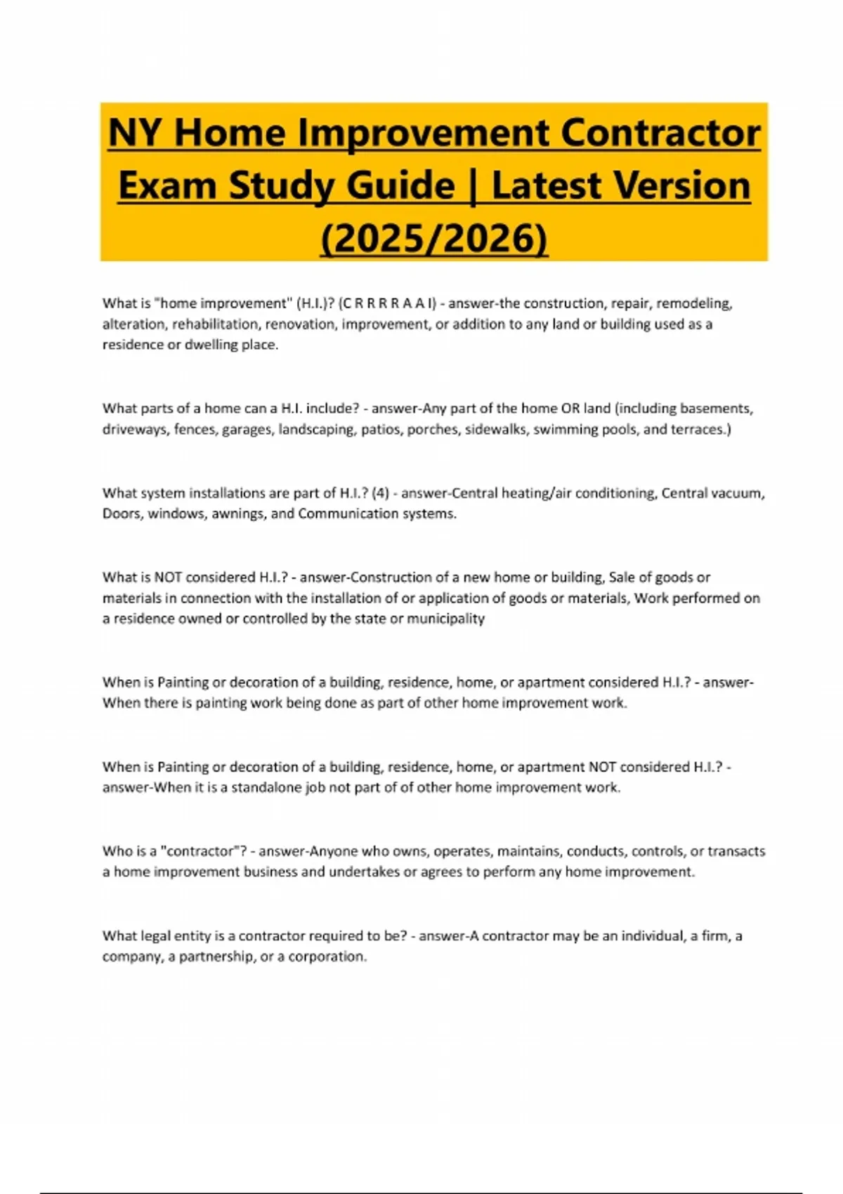 NY Home Improvement Contractor Exam Study Guide | Latest Version (2025/2026) What is "home improvement" (H.I.)? (C R R R R A A I) - answer-the construction, repair, remodeling, alteration, rehabilitation, renovation, improvement, or addition to any land or building used as a residence or dwelling place. What parts of a home can a H.I. include? - answer-Any part of the home OR land (including basements, driveways, fences, garages, landscaping, patios, porches, sidewalks, swimming pools, and terraces.) What system installations are part of H.I.? (4) - answer-Central heating/air conditioning, Central vacuum, Doors, windows, awnings, and Communication systems. What is NOT considered H.I.? - answer-Construction of a new home or building, Sale of goods or materials in connection with the installation of or application of goods or materials, Work performed on a residence owned or controlled by the state or municipality When is Painting or decoration of a building, residence, home, or apartment considered H.I.? - answerWhen there is painting work being done as part of other home improvement work. When is Painting or decoration of a building, residence, home, or apartment NOT considered H.I.? - answer-When it is a standalone job not part of of other home improvement work. Who is a "contractor"? - answer-Anyone who owns, operates, maintains, conducts, controls, or transacts a home improvement business and undertakes or agrees to perform any home improvement. What legal entity is a contractor required to be? - answer-A contractor may be an individual, a firm, a company, a partnership, or a corporation.What is a H.I. contract? - answer-An agreement between a contractor and a consumer or tenant for performance of a home improvement What must a H.I. contract detail? - answer-All labor, services, and materials to be furnished and performed. Who is a "salesperson"? - answer-Someone who negotiates a H.I. contract with a consumer or tenant, or solicits a home improvement contract from an owner or tenant.