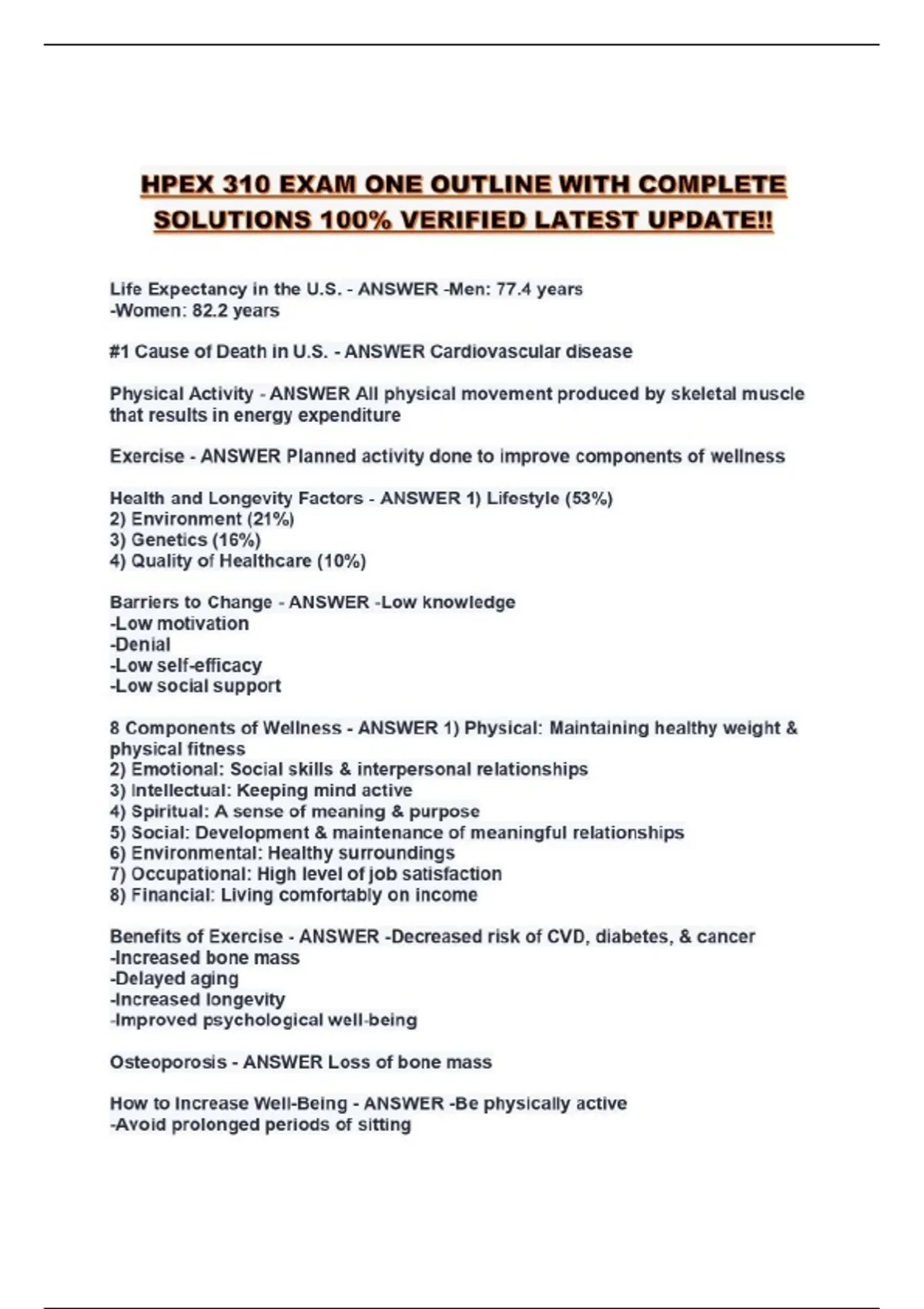 HPEX 310 EXAM ONE OUTLINE WITH COMPLETE SOLUTIONS 100% VERIFIED LATEST UPDATE!!...