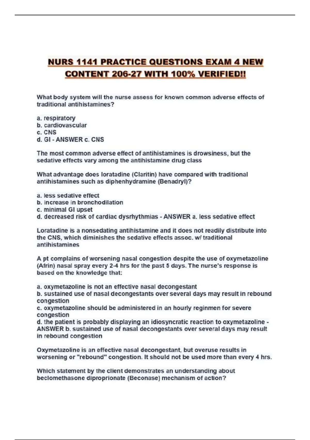 NURS 1141 PRACTICE QUESTIONS EXAM 4 NEW CONTENT 206-27 WITH 100% VERIFIED!!...