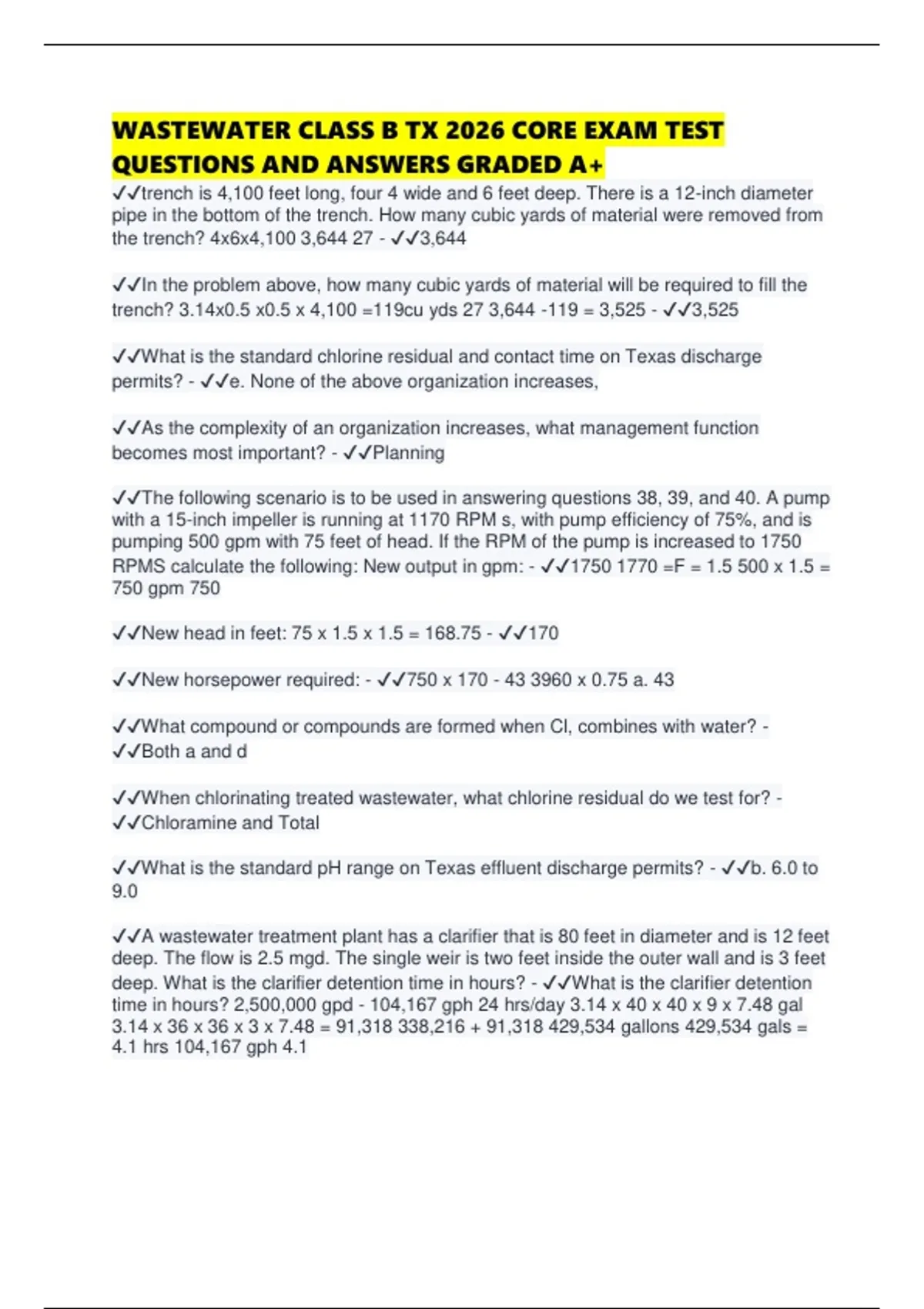 WASTEWATER CLASS B TX 2026 CORE EXAM TEST QUESTIONS AND ANSWERS GRADED A+