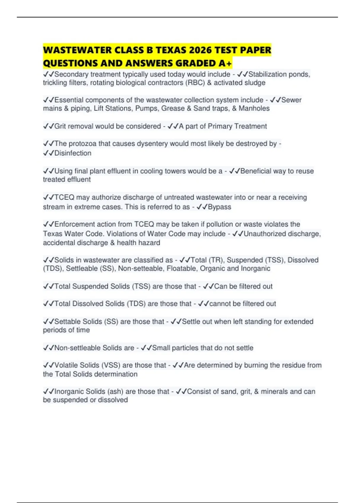 WASTEWATER CLASS B TEXAS 2026 TEST PAPER QUESTIONS AND ANSWERS GRADED A+