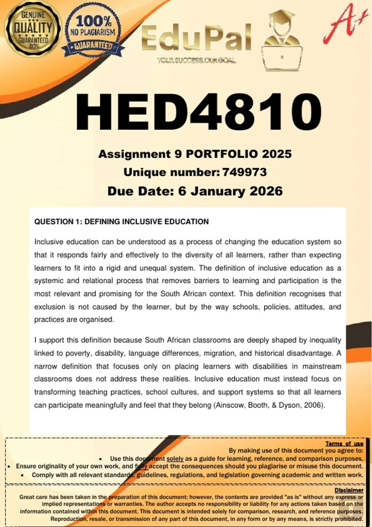 HED4810 Assignment 9 Final Portfolio (COMPLETE ANSWERS) 2025 - DUE 6 January 2026; 100% TRUSTED Complete, trusted solutions and explanations. For assistance, Whats-App 0.6.7-1.7.1-1.7.3.9. Ensure your success with us.. Good news! You have been appointed as the Chief Director in charge of Inclusive Education by the Minister of Basic Education, Ms. Siviwe Gwarube. Congratulations! Minister Gwarube has announced that inclusive education will be her priority. She wants you to do the following: Question 1: Defining inclusive education In this module, we have explored several definitions of Inclusive Education. In the module’s readings, some are explicitly labelled as definitions, while others are implied within the text. Select one definition and explain why you believe it is the most relevant and promising for the South African context. If you feel that none of the provided definitions are adequate, you may create your own. However, if you choose to do so, you must provide a detailed explanation of why you developed a new definition. Do not fall into the trap of just picking the first definition presented in the course! Later, you will be asked to link your analyses and recommendations back to this definition. It is therefore necessary to give this careful thought. Your answer should contain no more than 300 words (1 typed page), and at least three in-text citations of different sources. The reference list for each question should appear immediately after that question, not combined in a section at the back of the assignment as a whole. (10 marks) Question 2: Barriers to the effective implementation of inclusive education Clasquin-Johnson and Johnson (2025) note that although South Africa adopted Education for All in 1994 when it ratified the Programme of Action adopted at the Salamanca conference, exclusion from education persists thirty years later. ASSIGNMENT 09 HED4810 2025 7 Write a 300-word essay (1 typed page) explaining why more than 70% of South African learners with disabilities are out of school entirely in 2025. In your essay, you should identify and discuss the barriers to the effective implementation of inclusive education. A minimum of three in-text citations (references) of different sources should accompany your response. (Remember to add the reference list for this question immediately after your answer and not combined at the back of the assignment.) (10 Marks) Reference list Clasquin-Johnson, M.G. & Johnson, E. (2025). Training South African teachers to include learners with autism: reflections from participants. In Halder, S. (Ed.) Handbook on Sustainability, Global Inclusion, and Culture: Interdisciplinary perspectives. India: Springer. Note: A copy of the chapter cited above is available on the module site. Question 3: Recommendations to overcome the barriers and strengthen inclusive education Many researchers have proposed strategies to strengthen inclusive education. Analyse five recommendations that you consider particularly effective for the South African context. Then, based on the definition you selected in Question 1, explain how these recommendations could help address the barriers you identified in Question 2. Be as specific and detailed as possible. Include the key teaching strategies, such as Universal Design for Learning, on which teachers will be trained. Your response should contain a minimum of five in-text citations of different sources and be presented in a maximum of 600 words (2 typed pages). You may use any of the recommendations listed in the study material, but evidence of independent further research will be rewarded. (Remember to add the reference list for this question immediately after your answer and not combined at the back of the assignment.) (20 marks) ASSIGNMENT 09 HED4810 2025 8 Question 4: A strategic implementation plan to strengthen inclusive education One of the main reasons why White Paper 6 on inclusive education (Department of Education, 2001) has failed is that an implementation plan was never developed to translate the policy into ACTION. In your new role, you must rectify this oversight by developing a 5-year action plan for all levels of government, specifically at the national, provincial, district, and school levels. Download an action plan template and complete it. Here are two examples; you can also design your own template. Click here for Example 1 template. Click here for Example 2template. Your action plan must guide the implementation of the recommendations of the five researchers you cited in Question 4 (you don’t need to cite them again) and must include the interests of ALL key education actors (role players). Present your response in at most 600 words (2 typed pages). (20 marks) Question 5: Resourcing your action plan Develop clear guidelines for how you will resource your action plan. Include both human and material resources. Your response should address resources at all levels, including national, provincial, district, and school levels, and should contain at most 600 words (2 typed pages). Remember to include at least three in-text references to different sources and to add the reference list for this question below your answer. (20 marks)