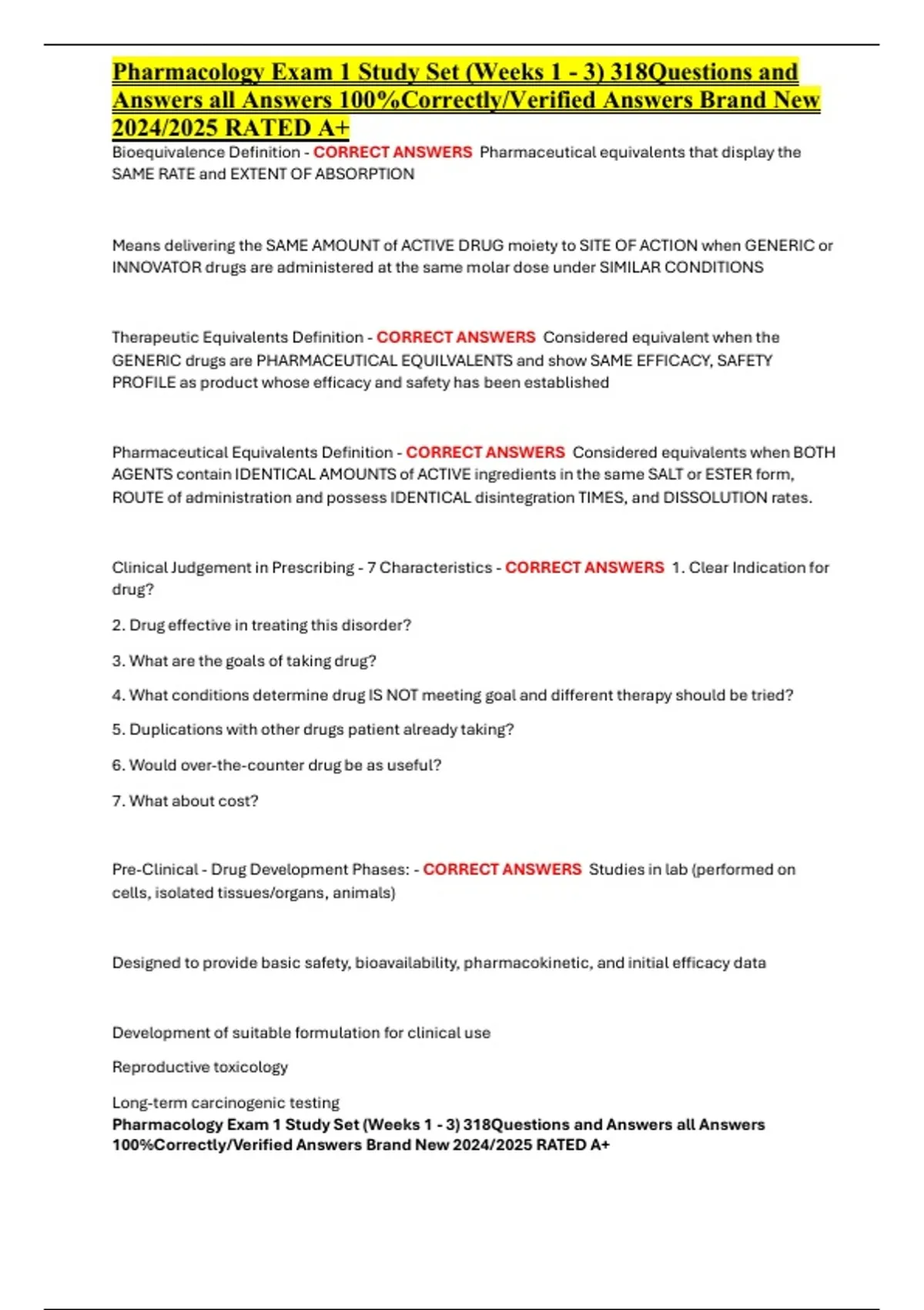 Pharmacology Exam 1 Study Set (Weeks 1 - 3) 318Questions and Answers all Answers