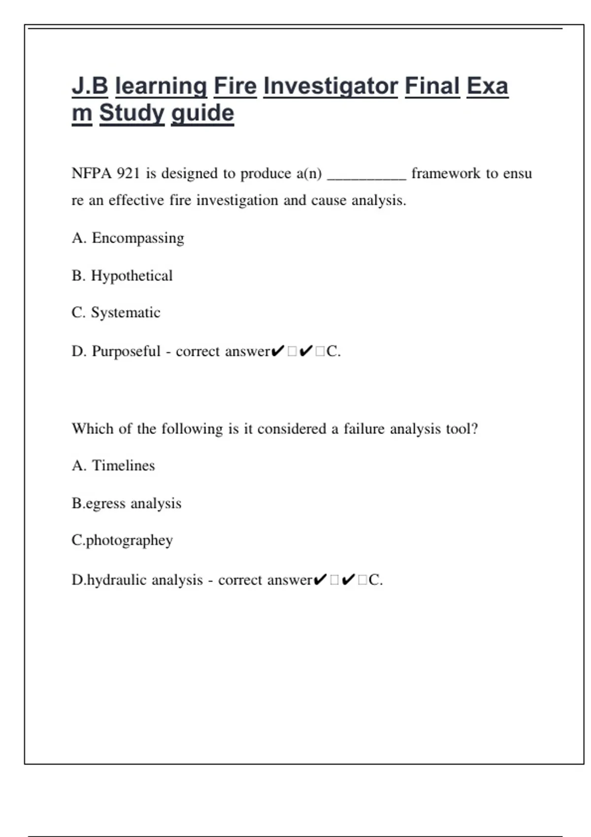 J.B learning Fire Investigator Final Exam Study guide.pdf with solutions