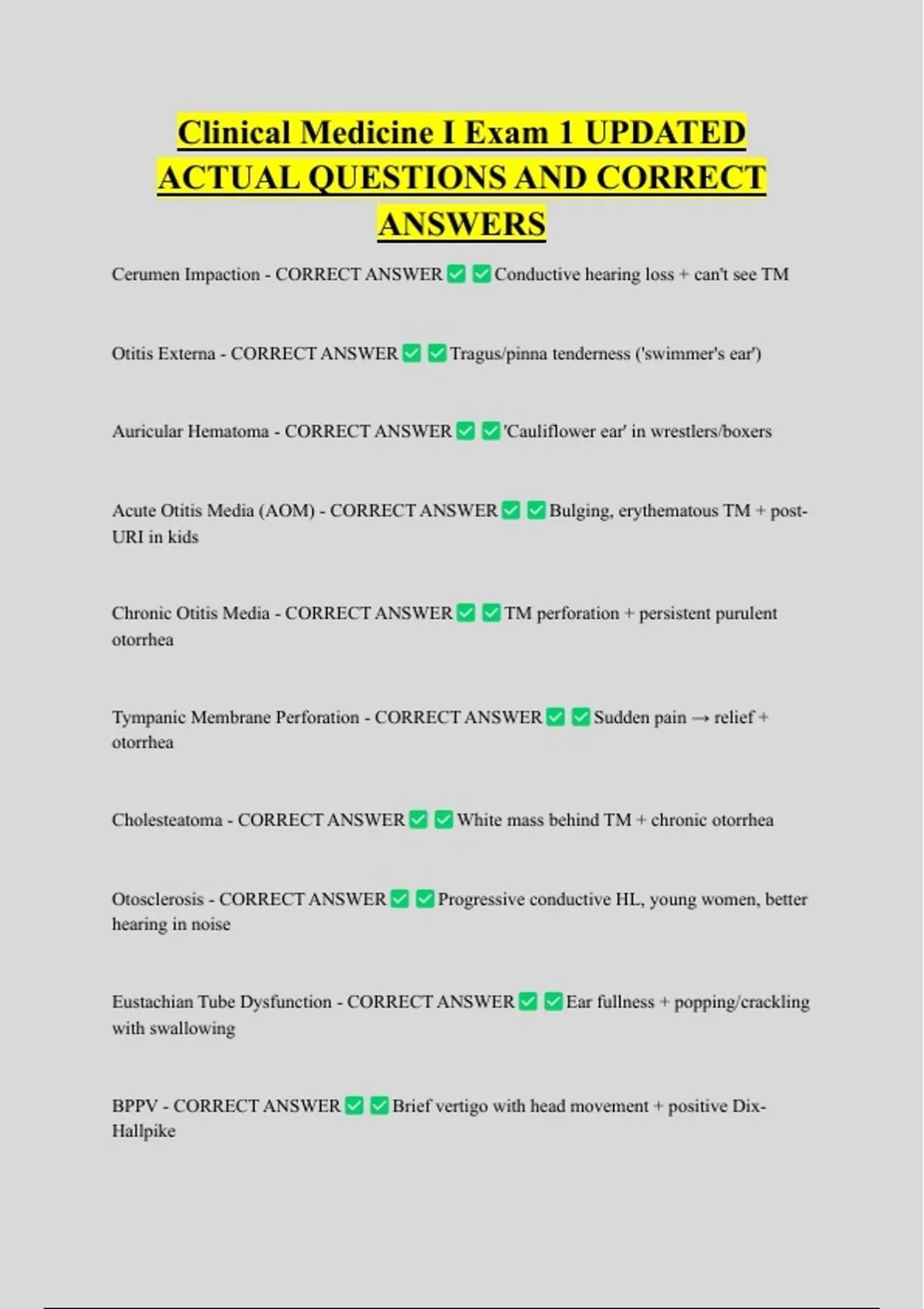 Clinical Medicine I Exam 1 UPDATED ACTUAL QUESTIONS AND CORRECT ANSWERS Cerumen Impaction - CORRECT ANSWER Otitis Externa - CORRECT ANSWER Auricular Hematoma - CORRECT ANSWER Conductive hearing loss + can't see TM Tragus/pinna tenderness ('swimmer's ear') 'Cauliflower ear' in wrestlers/boxers Acute Otitis Media (AOM) - CORRECT ANSWER URI in kids Chronic Otitis Media - CORRECT ANSWER otorrhea Tympanic Membrane Perforation - CORRECT ANSWER otorrhea Cholesteatoma - CORRECT ANSWER Bulging, erythematous TM + post TM perforation + persistent purulent Sudden pain → relief + White mass behind TM + chronic otorrhea Otosclerosis - CORRECT ANSWER hearing in noise Progressive conductive HL, young women, better Eustachian Tube Dysfunction - CORRECT ANSWER with swallowing BPPV - CORRECT ANSWER Ear fullness + popping/crackling Brief vertigo with head movement + positive Dix