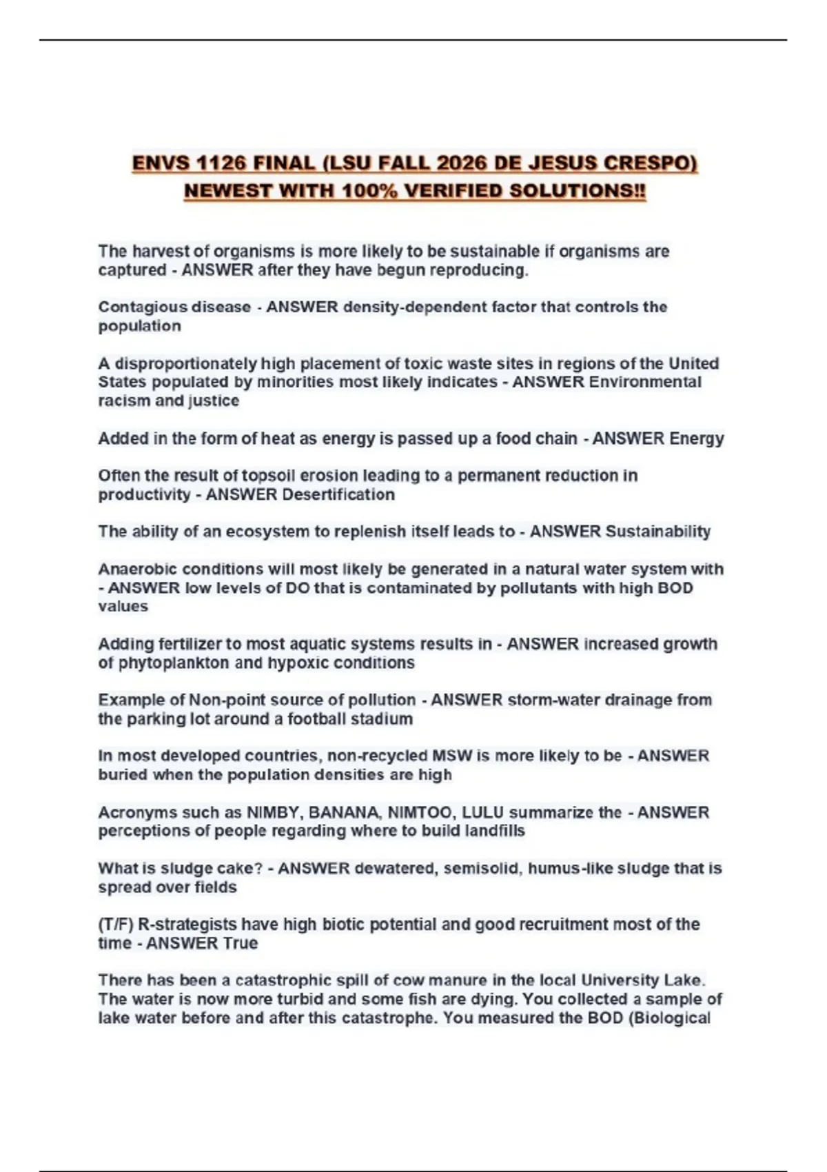 ENVS 1126 FINAL (LSU FALL 2026 DE JESUS CRESPO) NEWEST WITH 100% VERIFIED SOLUTIONS!!...