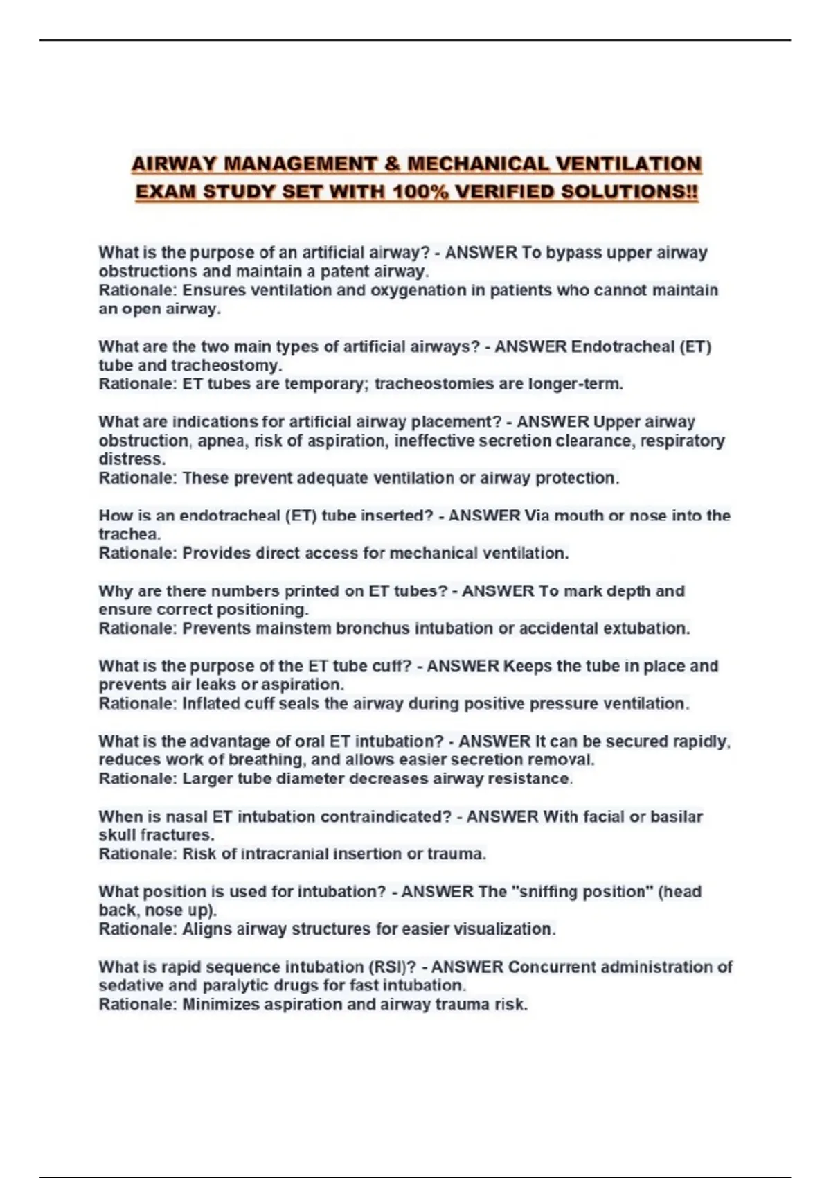 AIRWAY MANAGEMENT & MECHANICAL VENTILATION EXAM STUDY SET WITH 100% VERIFIED SOLUTIONS!!...