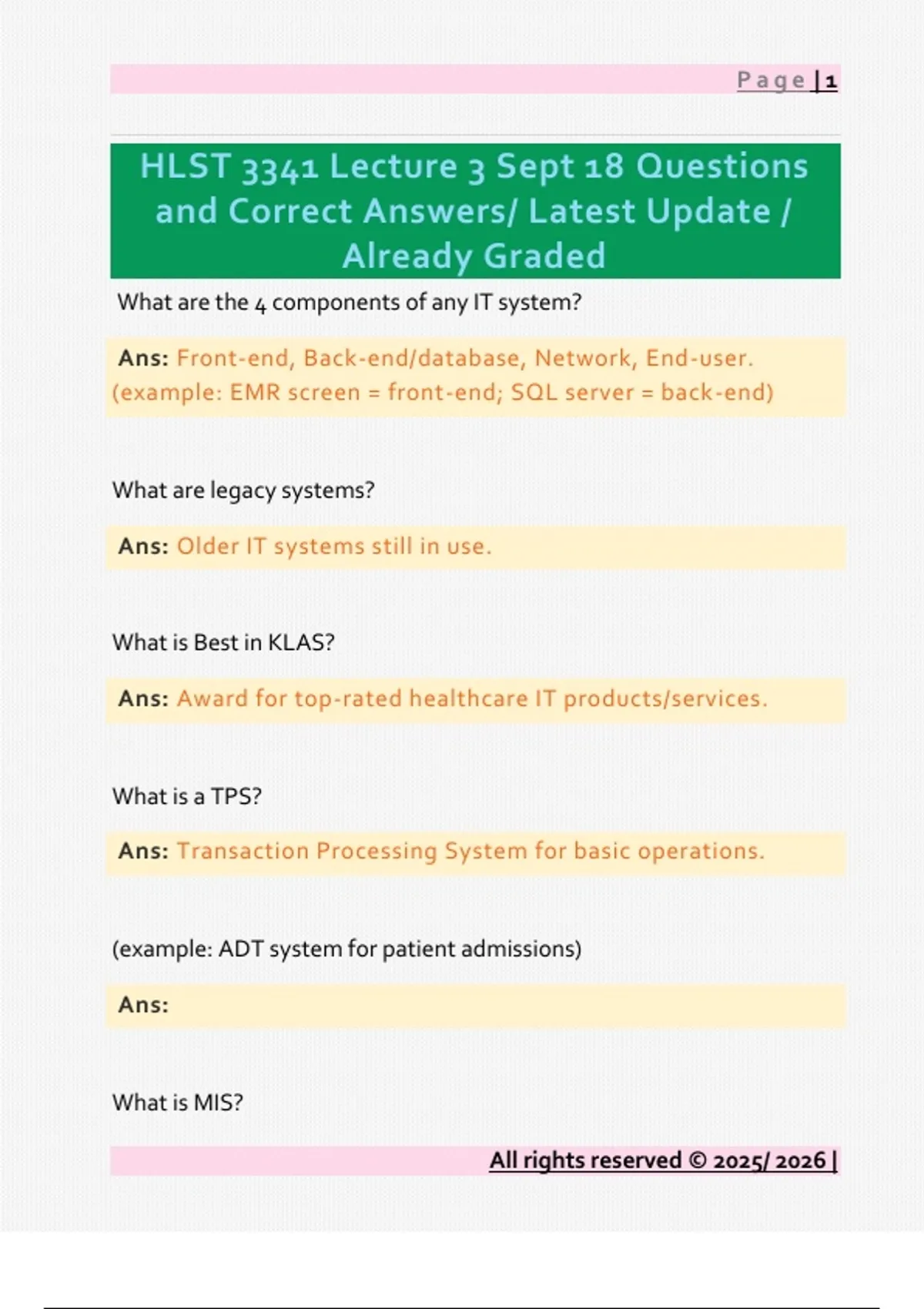 HLST 3341 Lecture 3 Sept 18 Questions and Correct Answers/ Latest Update / Already Graded