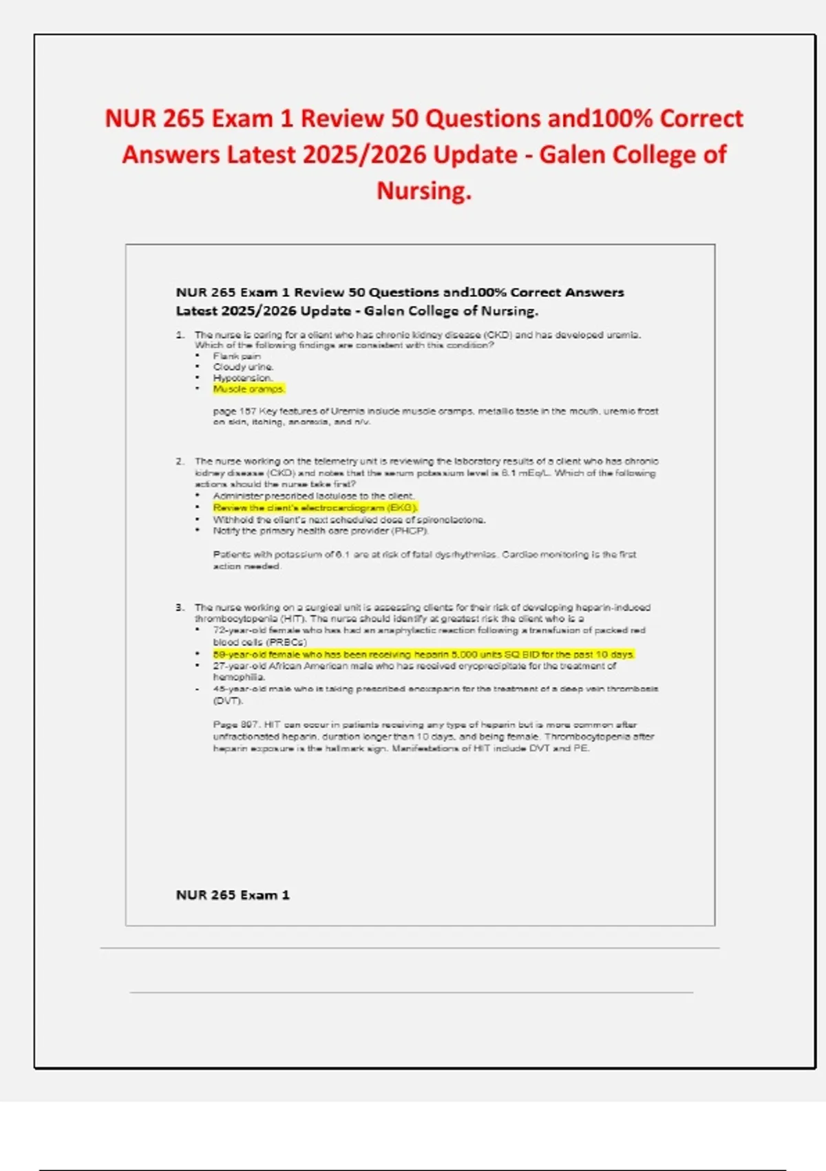 NUR 265 Exam 1 Review 50 Questions and100% Correct Answers Latest 2025/2026 Update - Galen College of Nursing