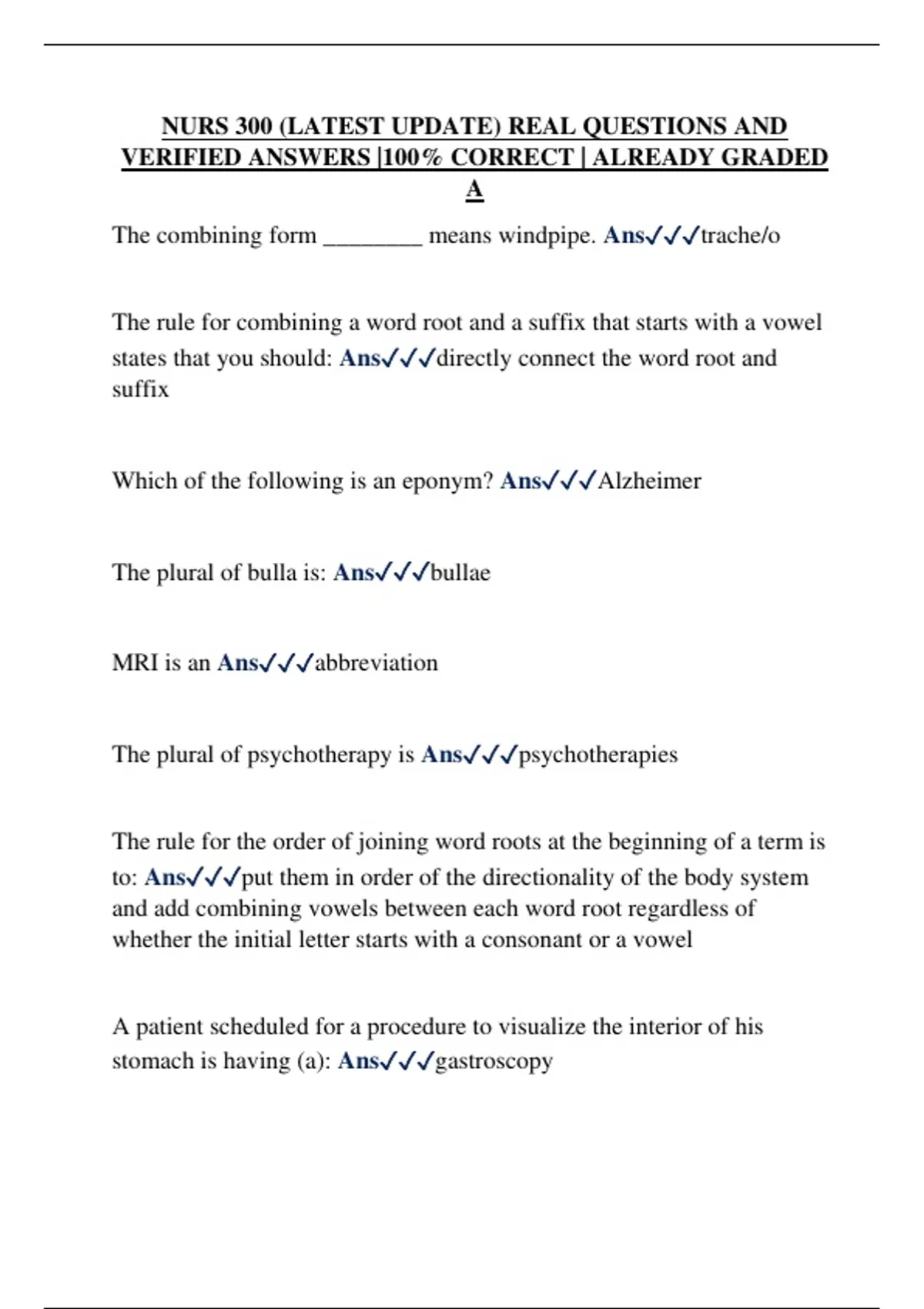NURS 300 (LATEST UPDATE) REAL QUESTIONS AND VERIFIED ANSWERS |100% CORRECT | ALREADY GRADED A