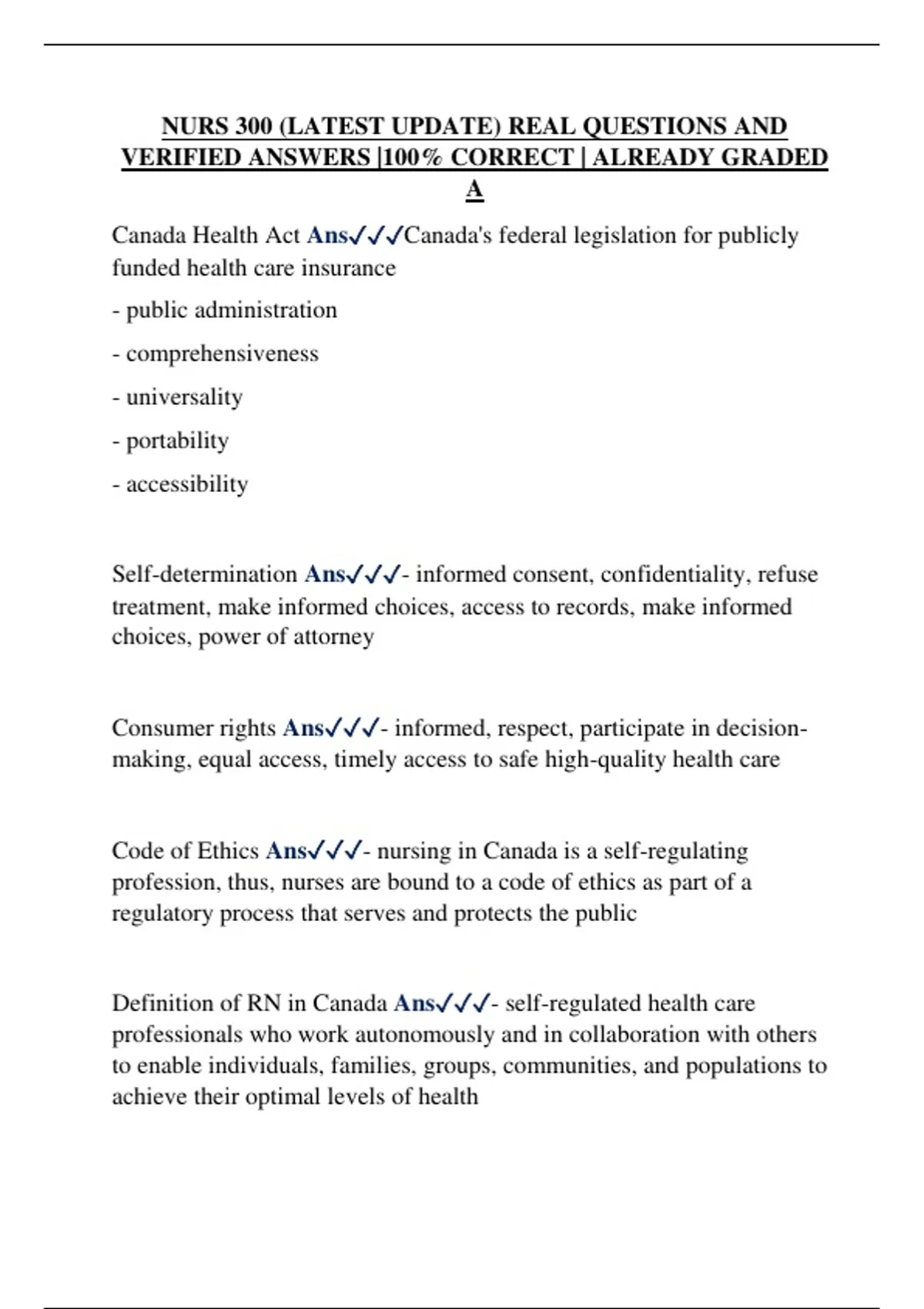 NURS 300 (LATEST UPDATE) REAL QUESTIONS AND VERIFIED ANSWERS |100% CORRECT | ALREADY GRADED A