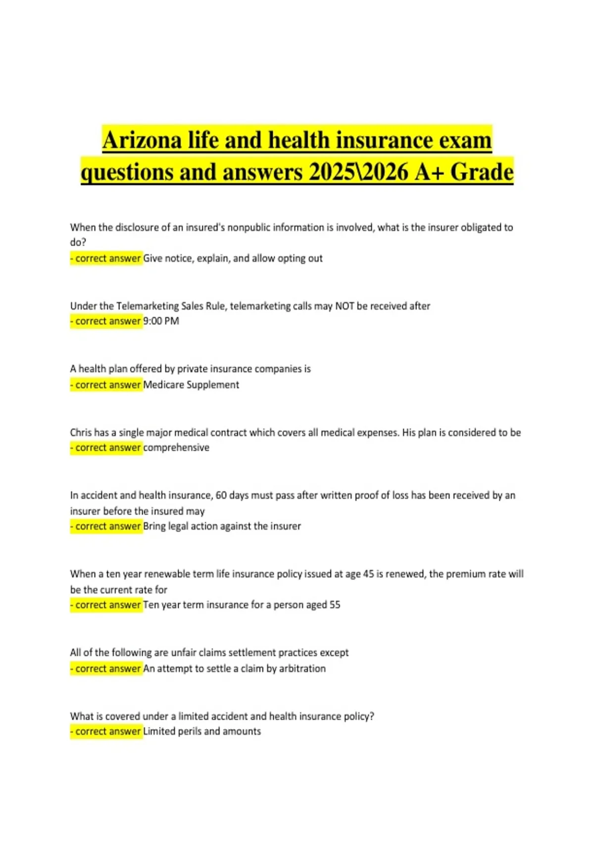 Arizona Life & Health Insurance Licensing Exam | Verified Practice Questions & Correct Detailed Answers | 2025/2026 A+ Grade