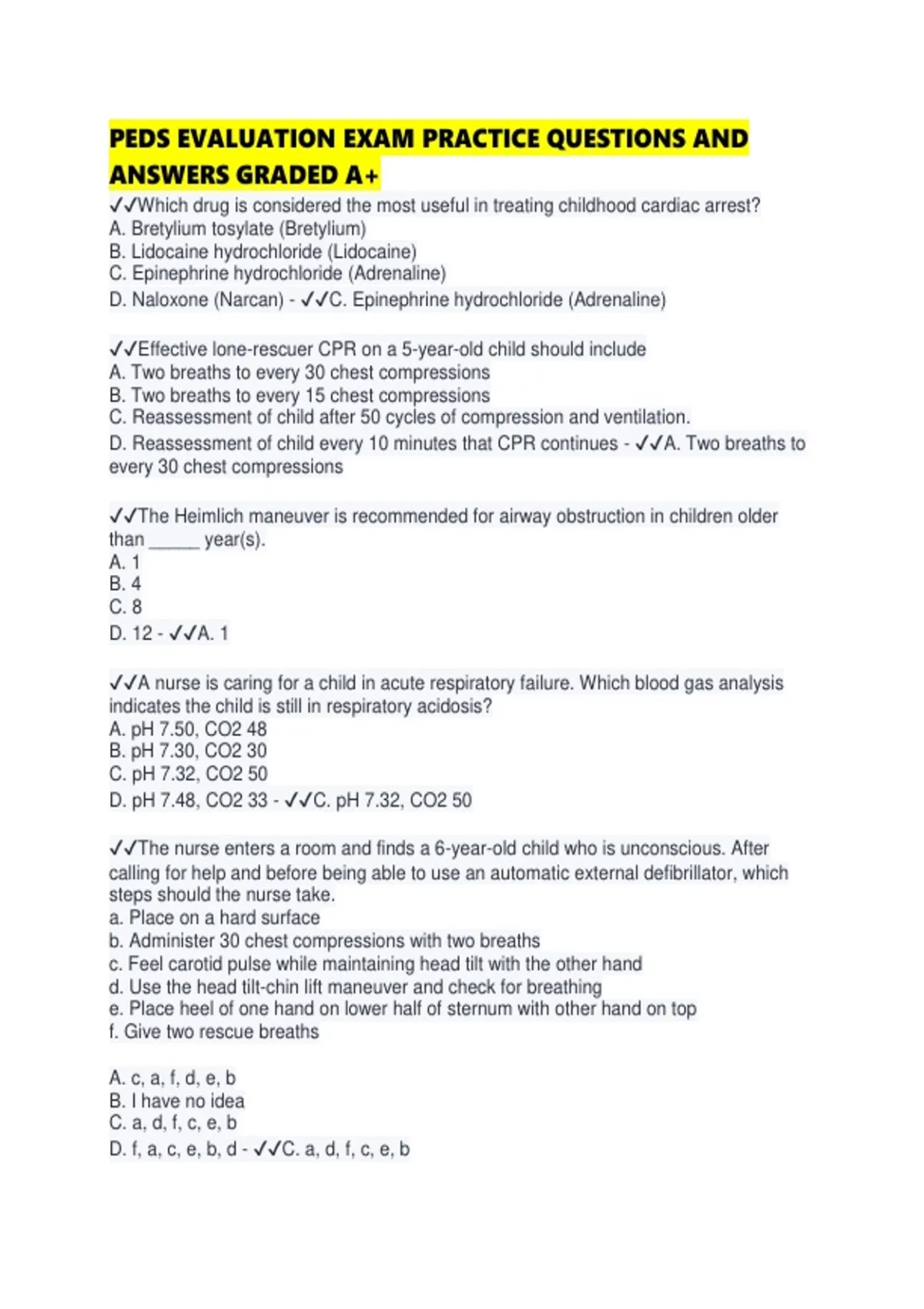 PEDS EVALUATION EXAM PRACTICE QUESTIONS AND ANSWERS GRADED A+
