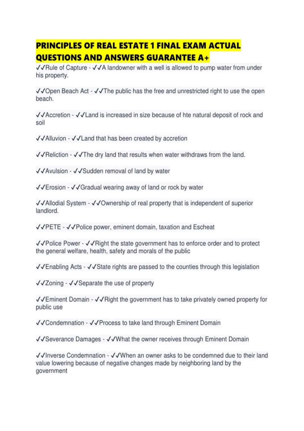 PRINCIPLES OF REAL ESTATE 1 FINAL EXAM ACTUAL QUESTIONS AND ANSWERS GUARANTEE A+