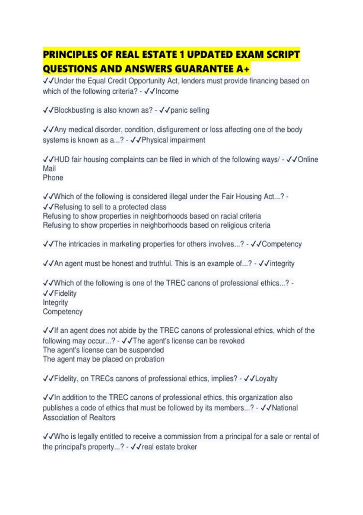 PRINCIPLES OF REAL ESTATE 1 UPDATED EXAM SCRIPT QUESTIONS AND ANSWERS GUARANTEE A+