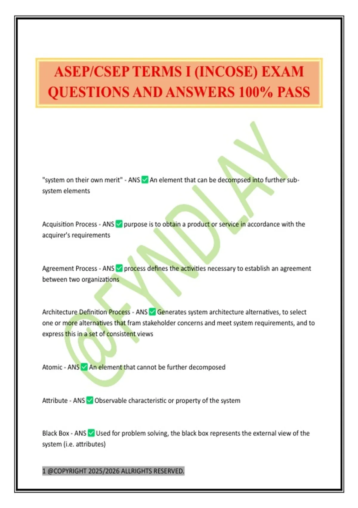 ASEP/CSEP TERMS I (INCOSE) EXAM QUESTIONS AND ANSWERS 100% PASS