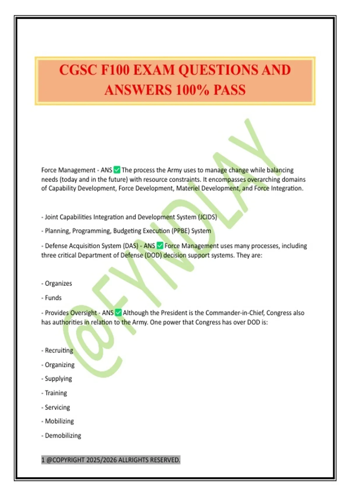 CGSC F100 EXAM QUESTIONS AND