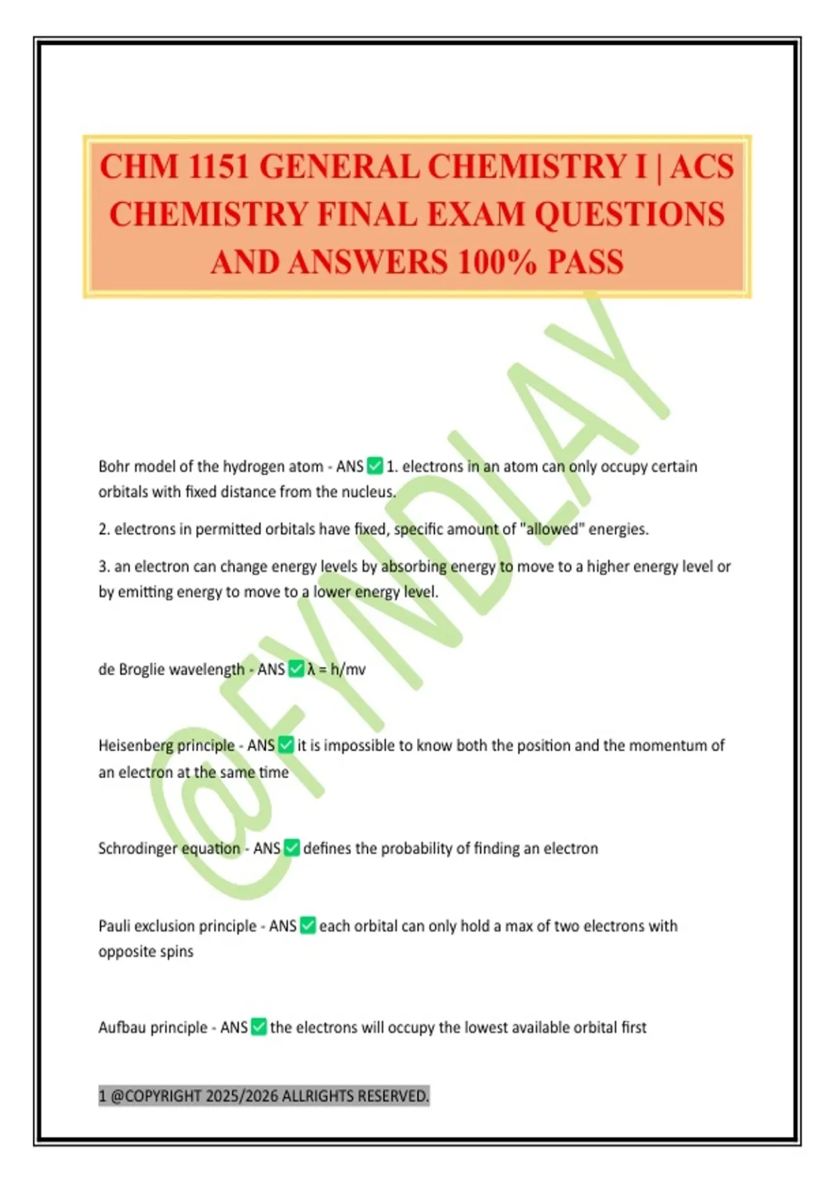 CHM 1151 GENERAL CHEMISTRY I | ACS CHEMISTRY FINAL EXAM QUESTIONS AND ANSWERS 100% PASS