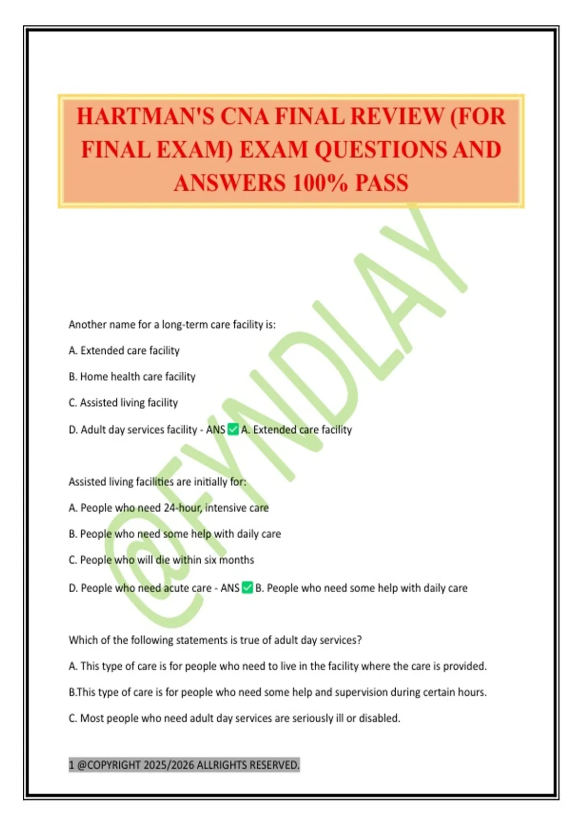 HARTMAN'S CNA FINAL REVIEW (FOR FINAL EXAM) EXAM QUESTIONS AND ANSWERS 100% PASS
