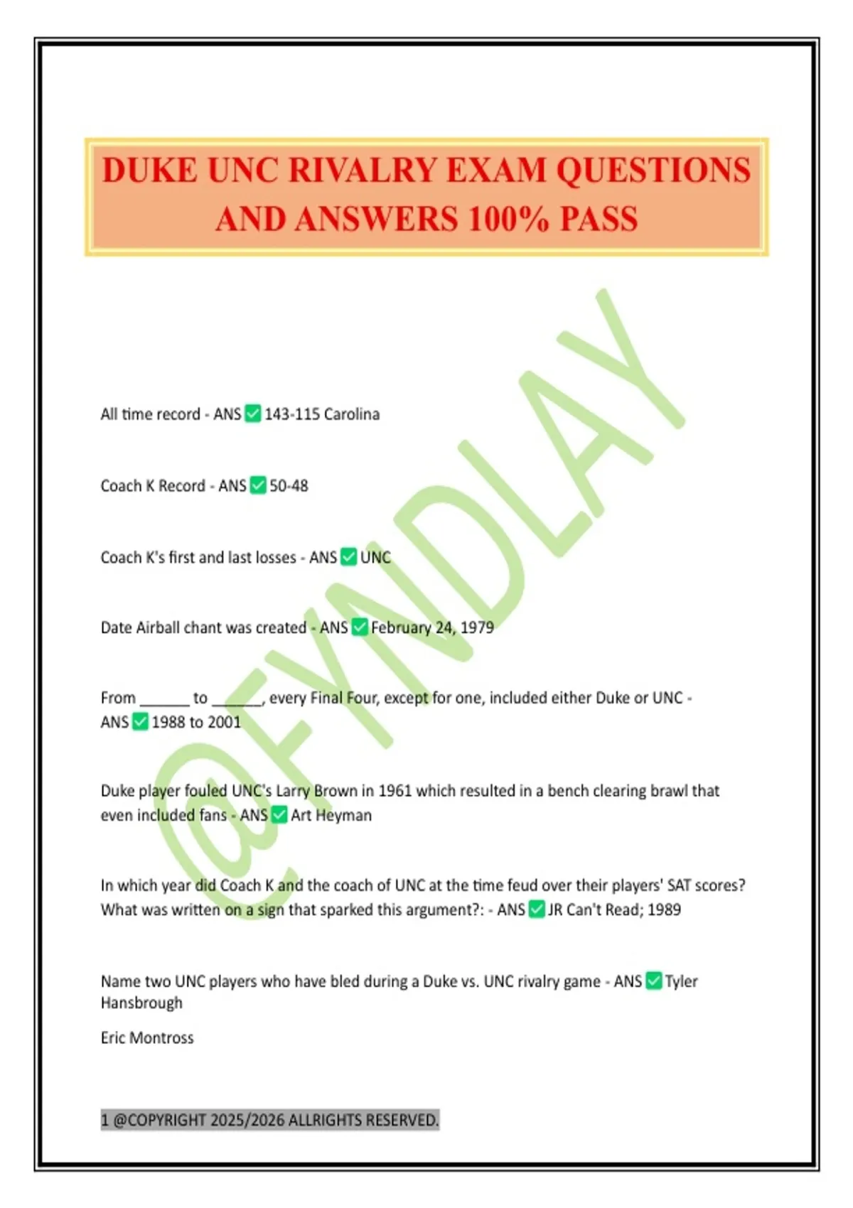 DUKE UNC RIVALRY EXAM QUESTIONS AND ANSWERS 100% PASS