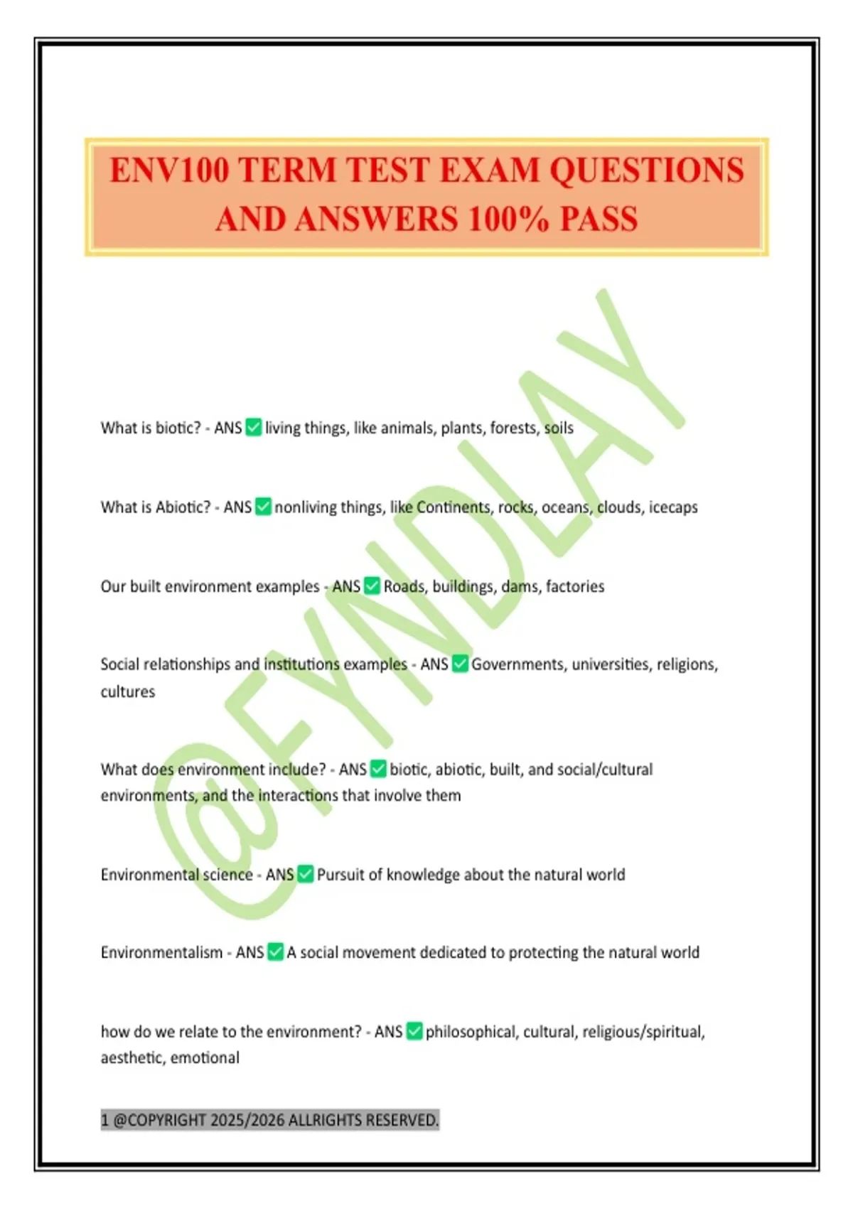 ENV100 TERM TEST EXAM QUESTIONS AND ANSWERS 100% PASS