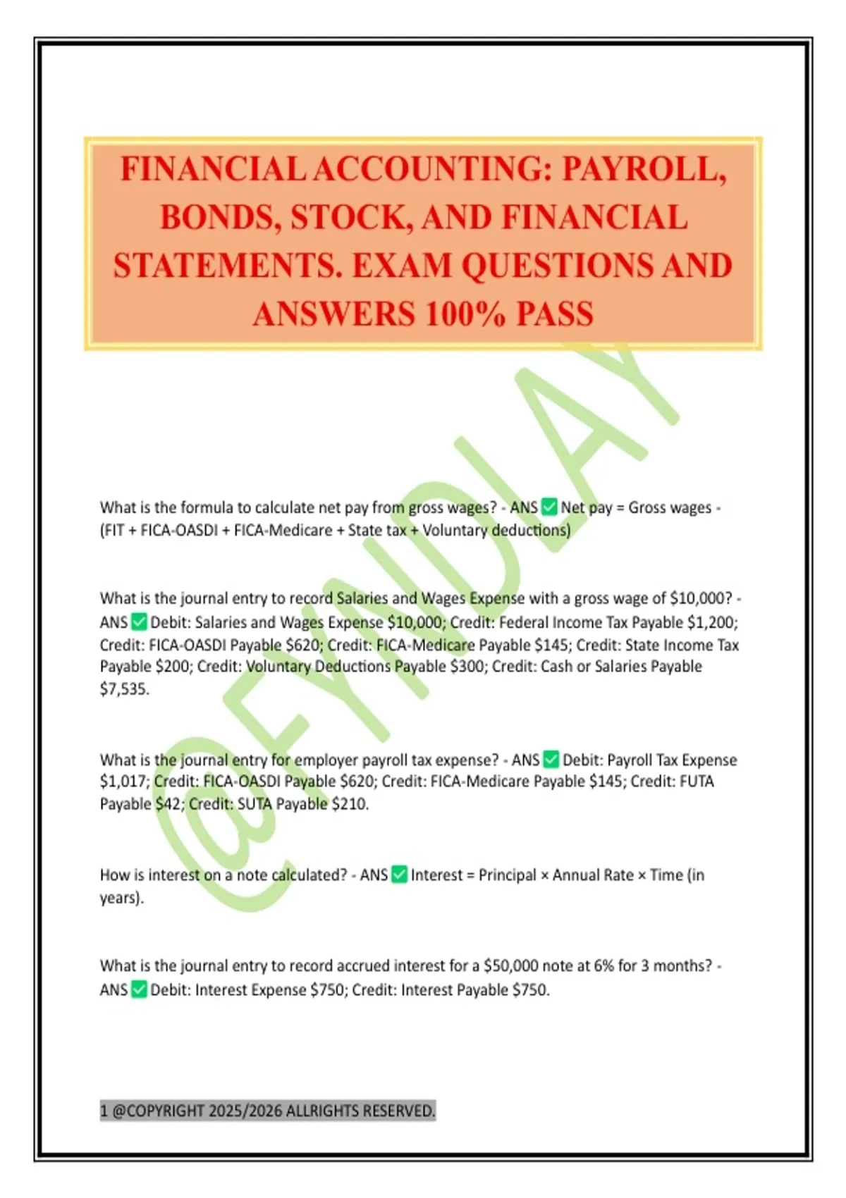 FINANCIAL ACCOUNTING: PAYROLL, BONDS, STOCK, AND FINANCIAL STATEMENTS. EXAM QUESTIONS AND ANSWERS 100% PASS