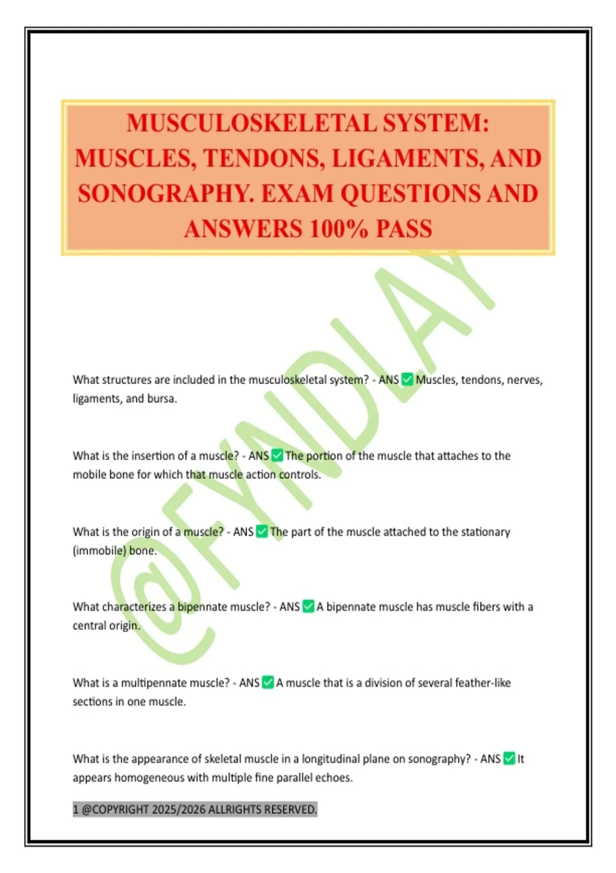 MUSCULOSKELETAL SYSTEM: MUSCLES, TENDONS, LIGAMENTS, AND SONOGRAPHY. EXAM QUESTIONS AND ANSWERS 100% PASS