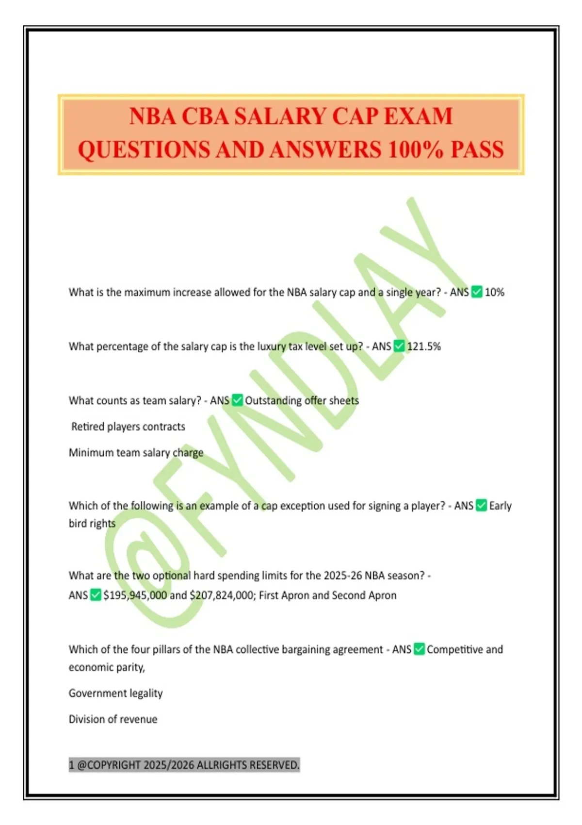 NBA CBA SALARY CAP EXAM QUESTIONS AND ANSWERS 100% PASS