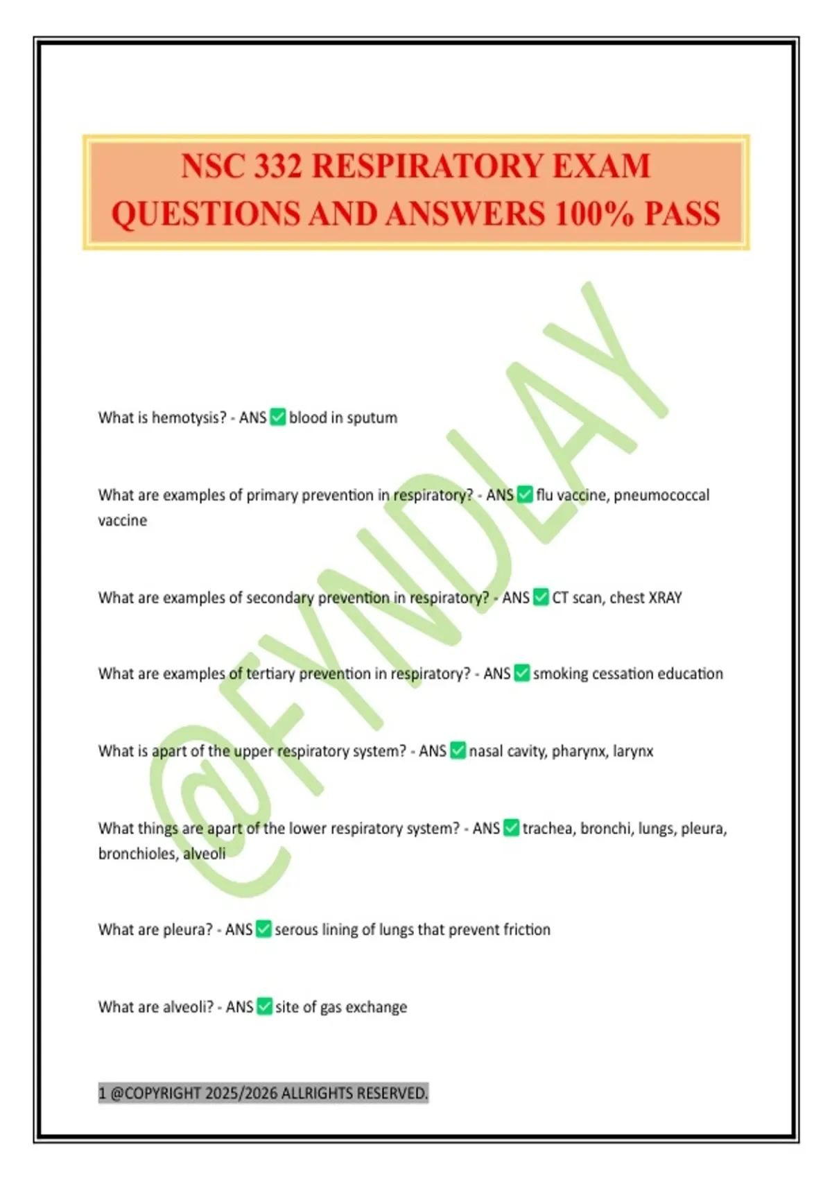 NSC 332 RESPIRATORY EXAM QUESTIONS AND ANSWERS 100% PASS
