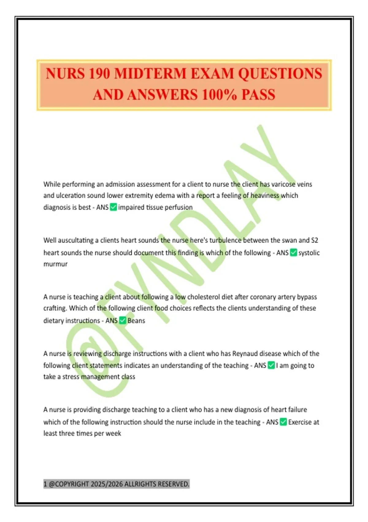 NURS 190 MIDTERM EXAM QUESTIONS AND ANSWERS 100% PASS
