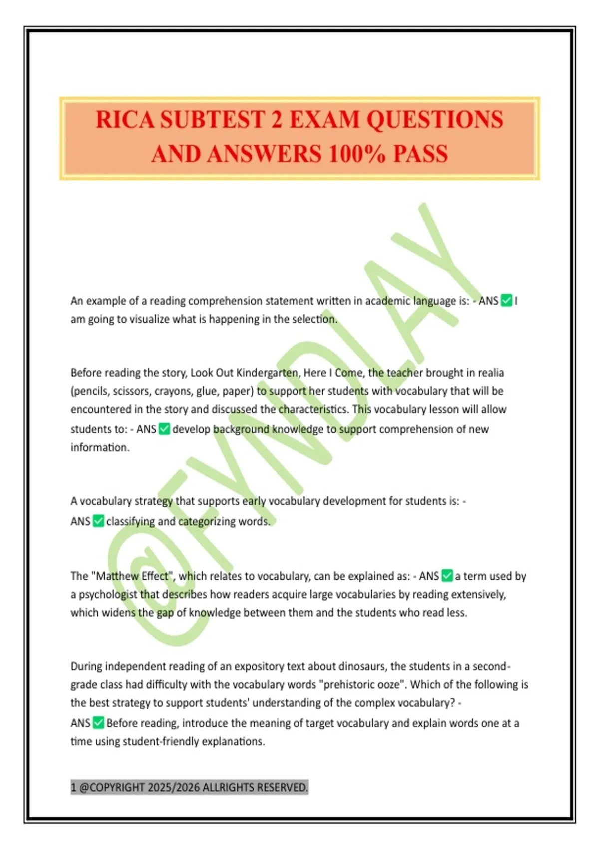 RICA SUBTEST 2 EXAM QUESTIONS AND ANSWERS 100% PASS