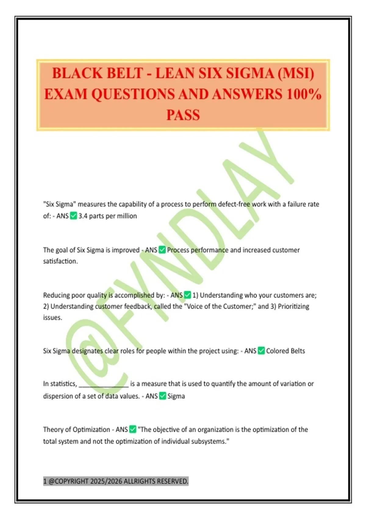 BLACK BELT - LEAN SIX SIGMA (MSI) EXAM QUESTIONS AND ANSWERS 100% PASS