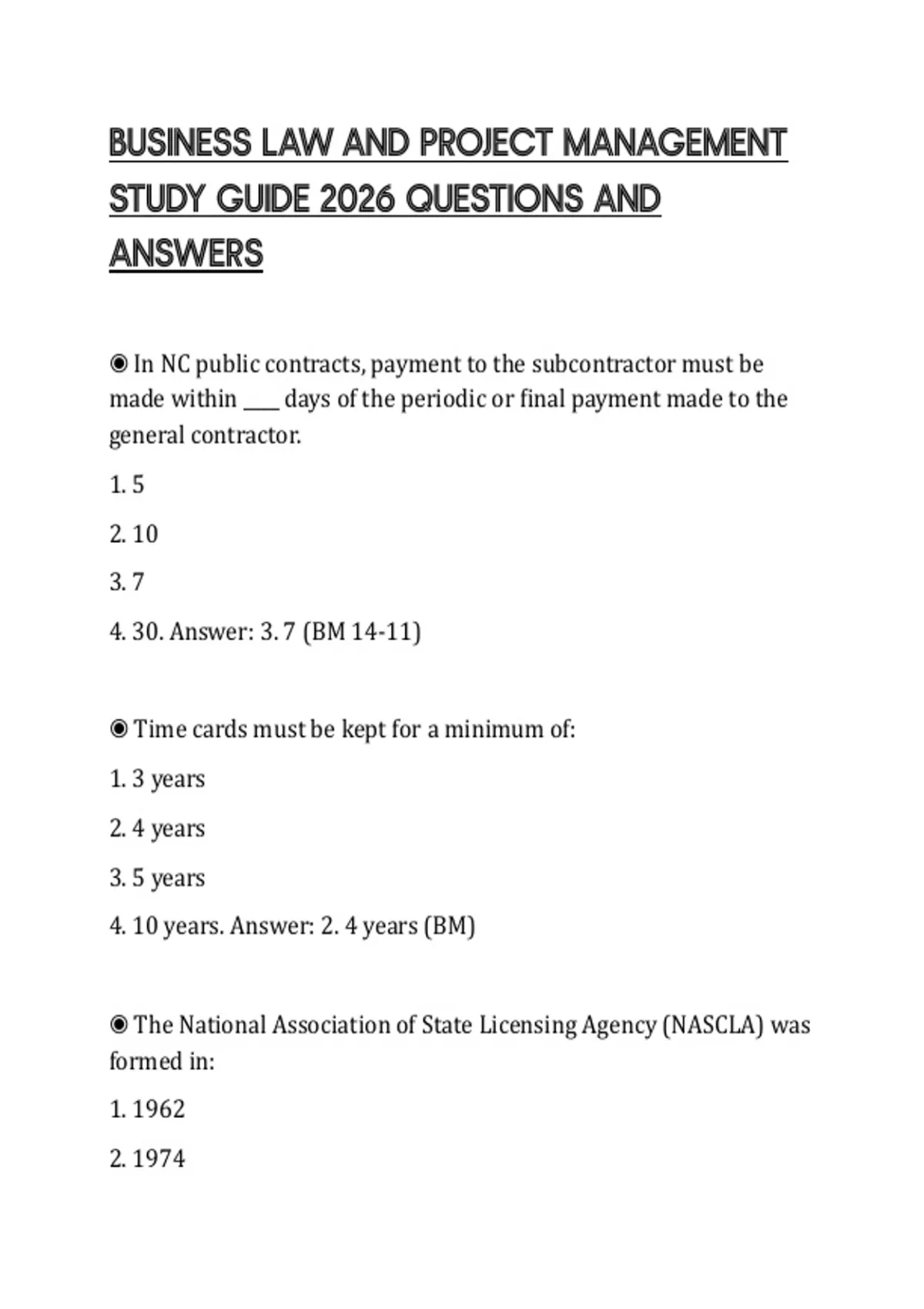 BUSINESS LAW AND PROJECT MANAGEMENT STUDY GUIDE 2026 QUESTIONS AND ANSWERS