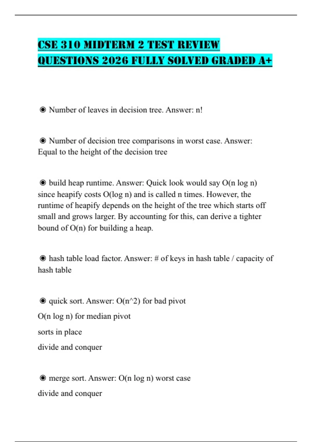◉ build heap runtime. Answer: Quick look would say O(n log n)