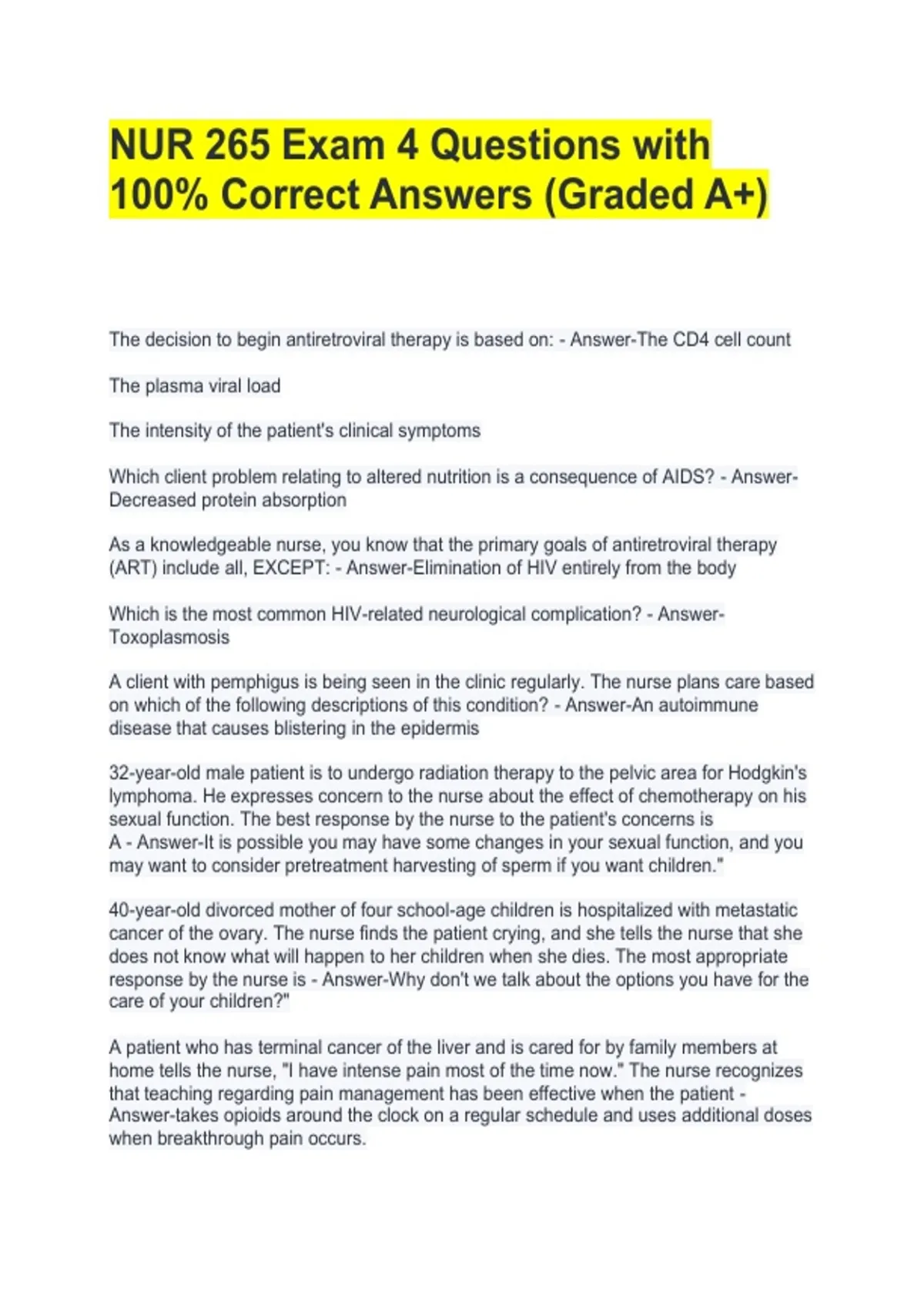 NUR 265 Exam 4 Questions with