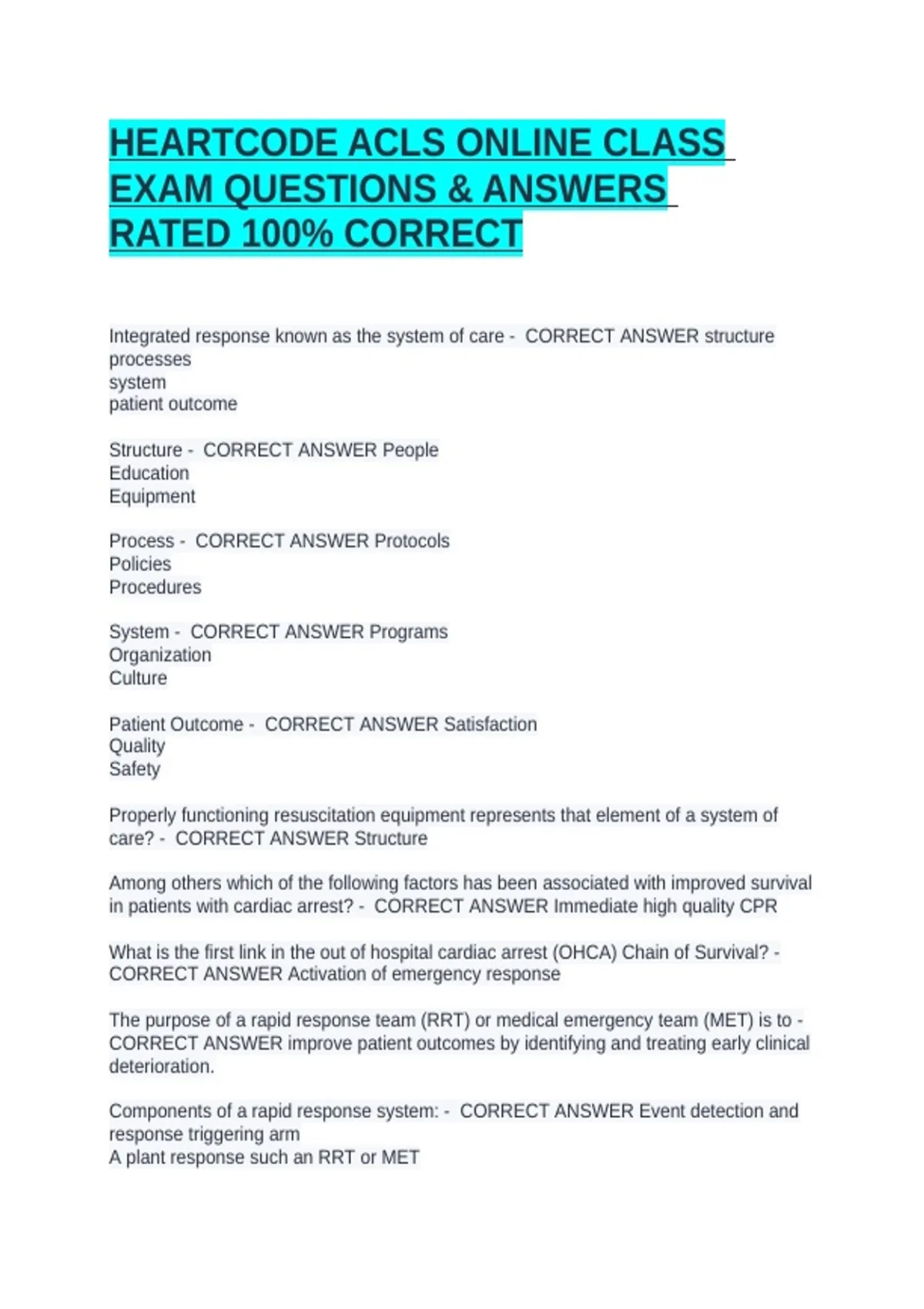 HEARTCODE ACLS ONLINE CLASS EXAM QUESTIONS & ANSWERS RATED 100% CORRECT is a professional-level emergency care course designed for healthcare providers who respond to cardiac arrest, stroke, and other life-threatening cardiovascular emergencies. It builds on Basic Life Support (BLS) and focuses on team-based, high-quality resuscitation in critical situations.