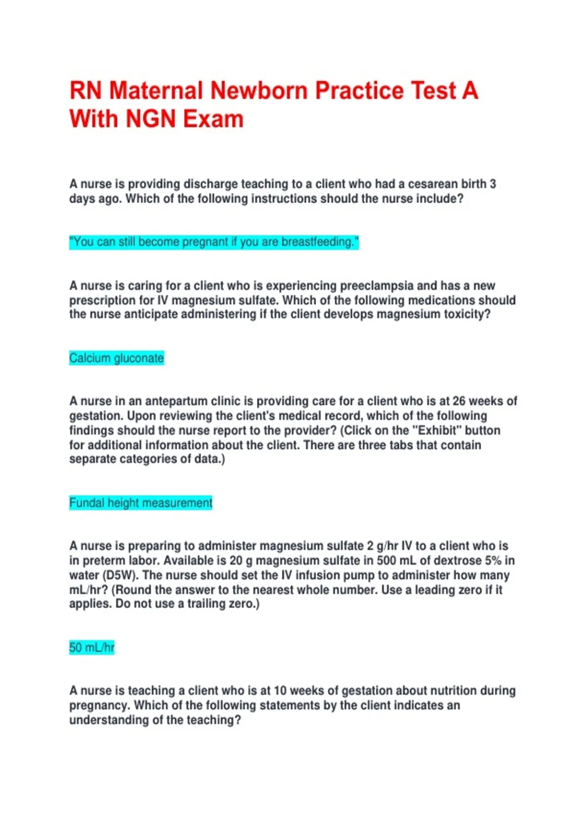 RN Maternal Newborn Practice Test A With NGN Exam