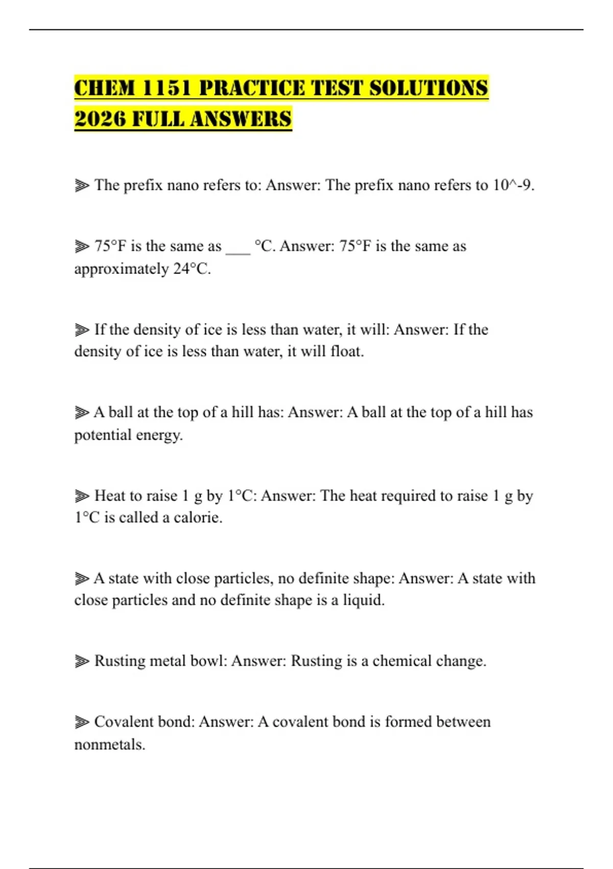 CHEM 1151 PRACTICE TEST SOLUTIONS 2026 FULL ANSWERS