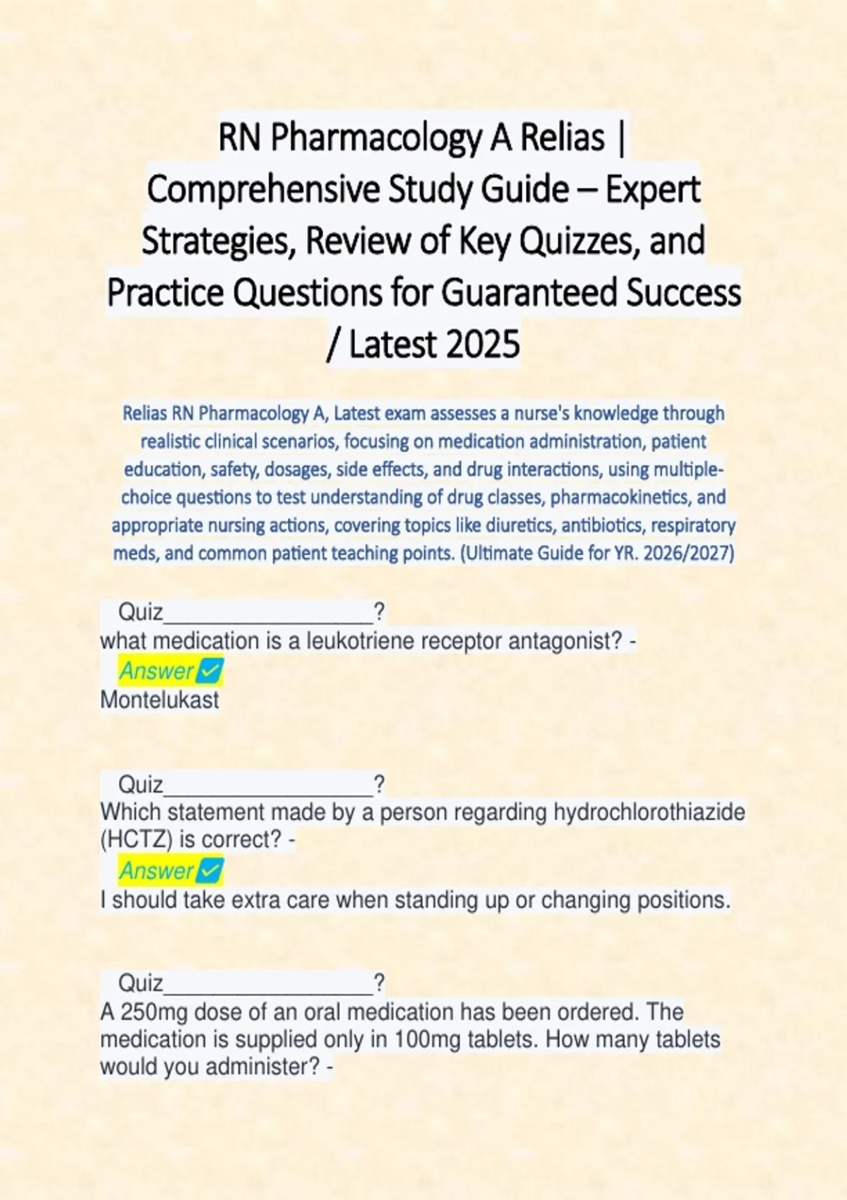 Relias RN Pharmacology A, Latest exam assesses a nurse's knowledge through